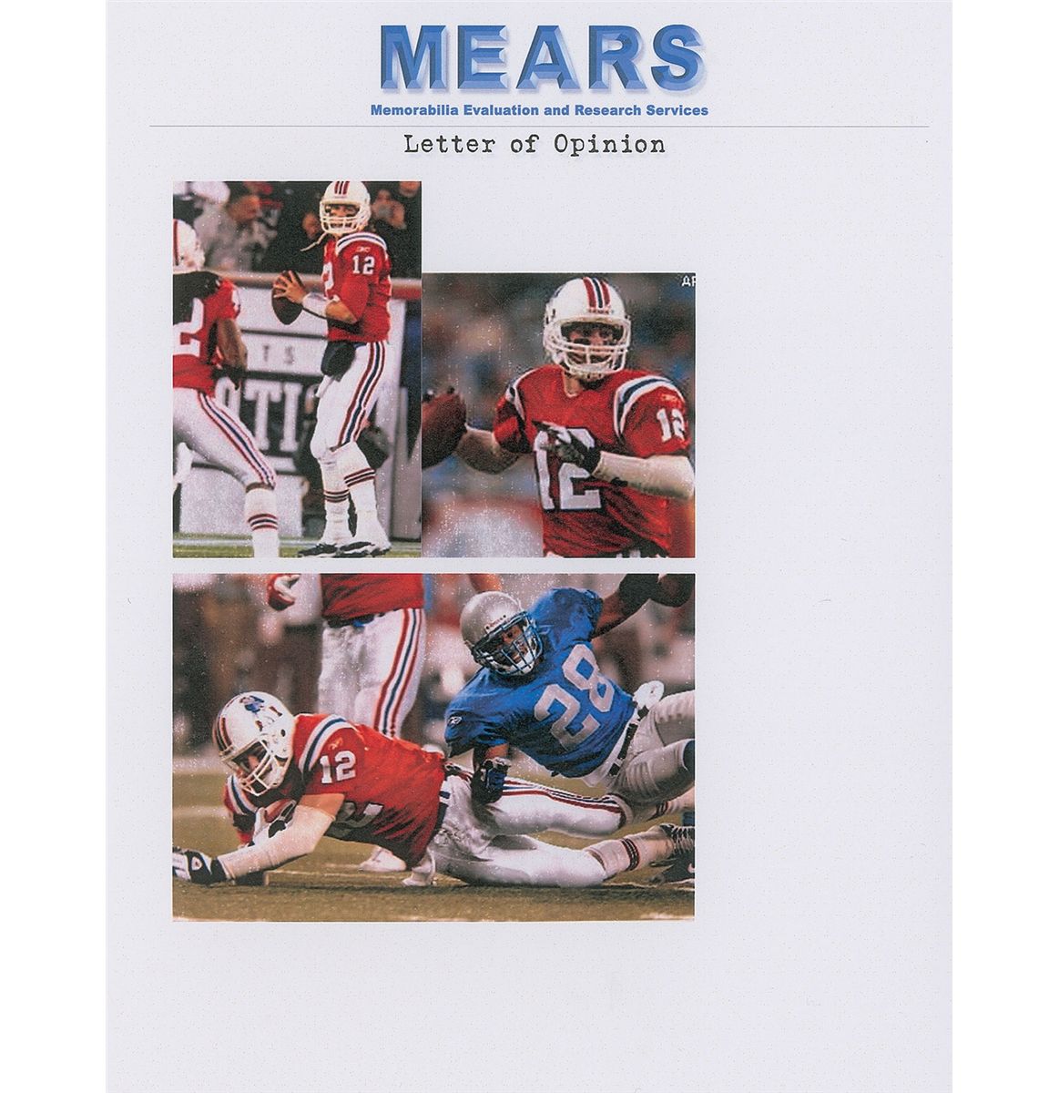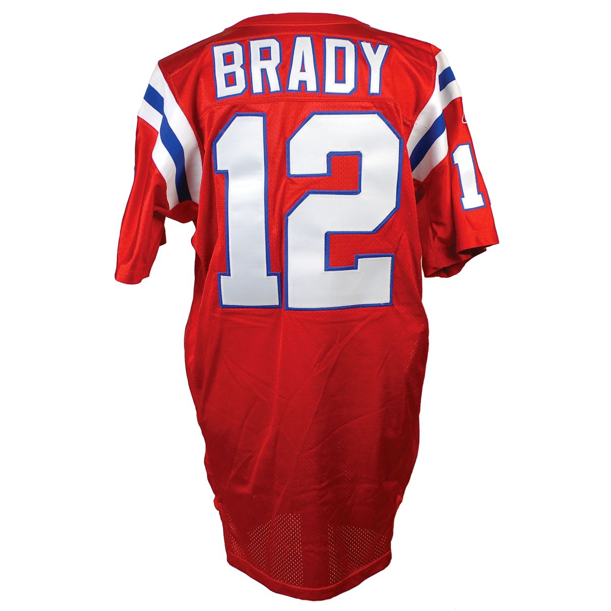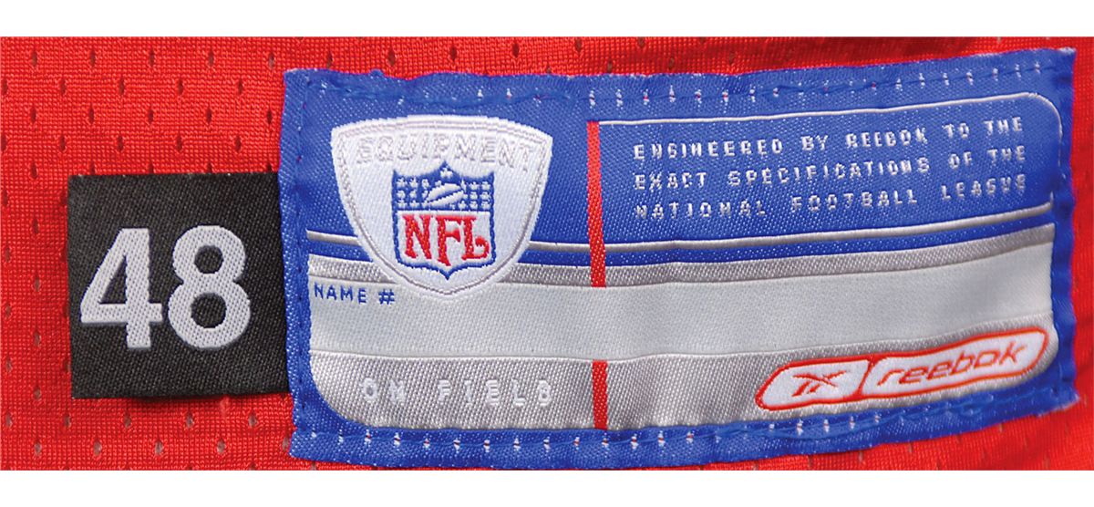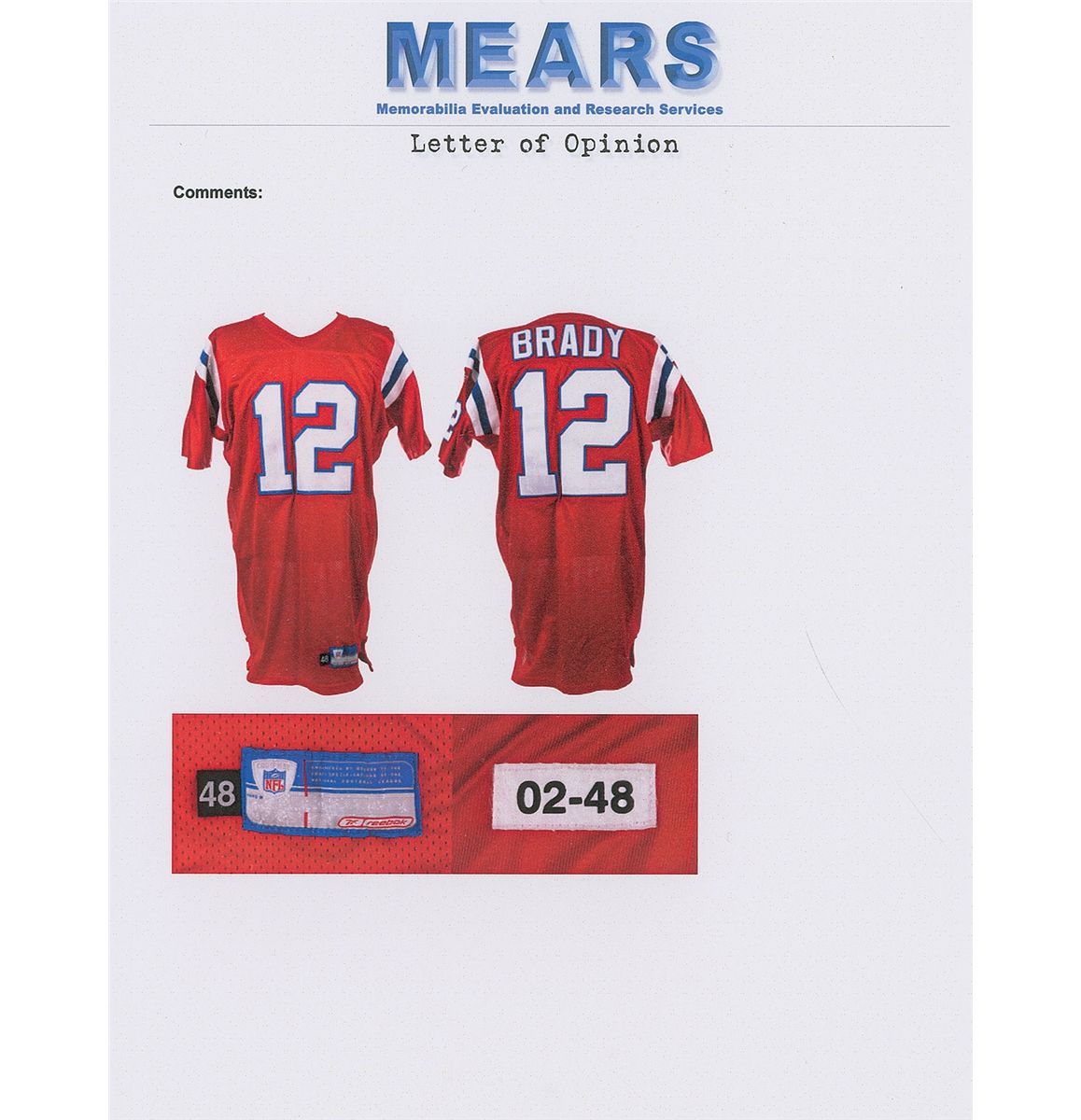 Brady’s special game-worn official Reebok ‘Turn Back the Clock’ New England Patriots jersey worn for only one game on Thanksgiving Day in 2002, when the Patriots defeated the Detroit Lions in a 20-12 victory. The red mesh jersey features his number “12” on the chest and back, with “Brady” across the shoulder area; both sleeves also have “12” and a Reebok patch. The correct Reebok manufacturer’s tag is sewn to the front left tail, with an adjacent flag tag indicating the size, “48.” The white strip tag sewn inside the back collar reads “02-48,” consistent with most other Reebok Patriots game-used jerseys. The jersey shows light wear, most notably on the front numbers, appropriate for single-game use. Accompanied by three photos showing Brady wearing this exact jersey during the 2002 Thanksgiving Day game, and letters of opinion from Mears and noted jersey expert Dave Miedema, with Mears evaluating it at a grade of A5 with respect to characteristics and game use. Game-used jerseys from this early point in his career are rare, with this being an especially appealing example due to its rare throwback design.