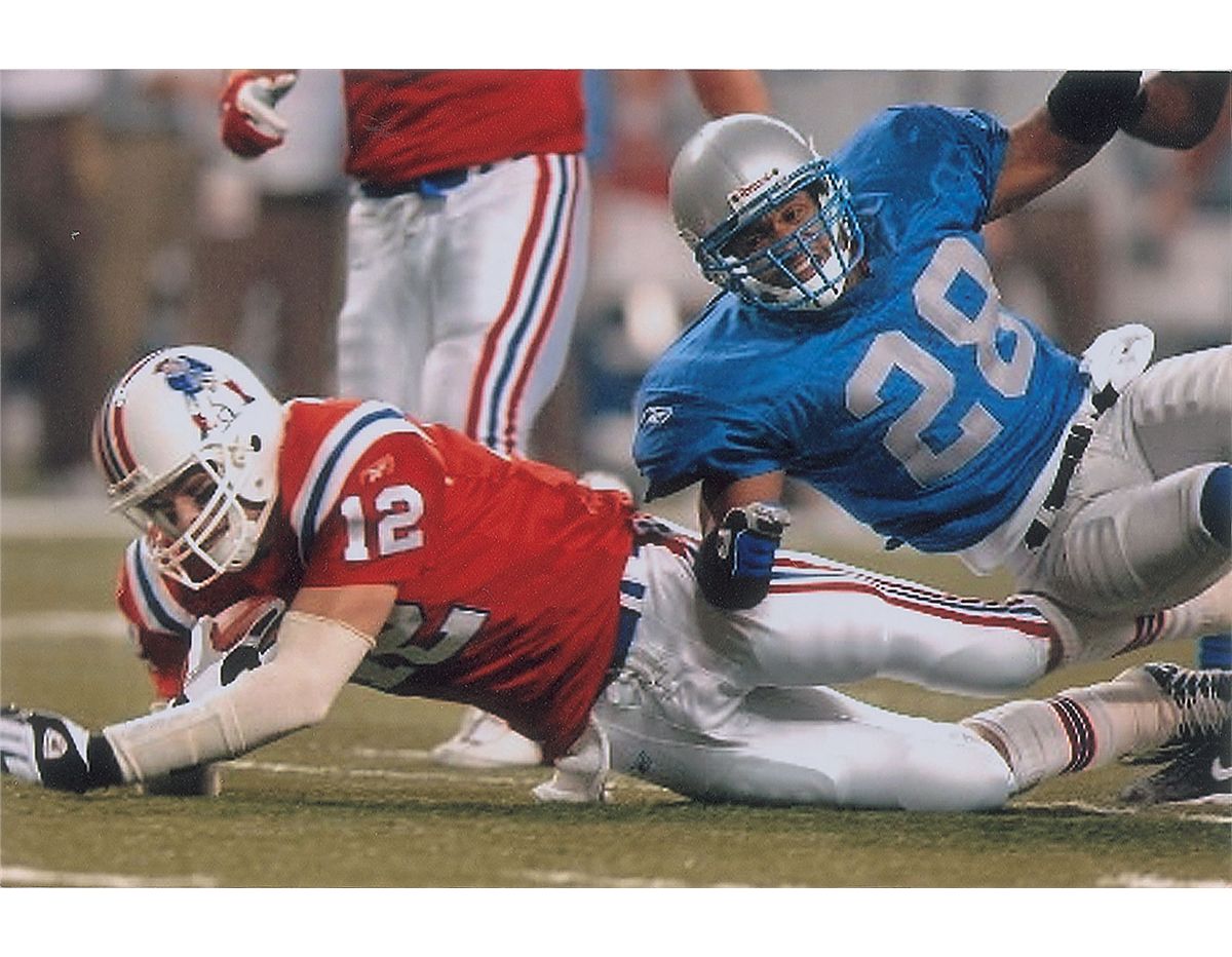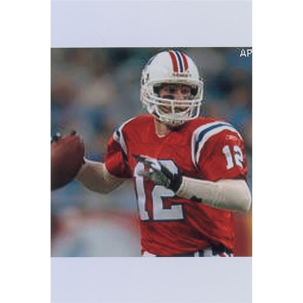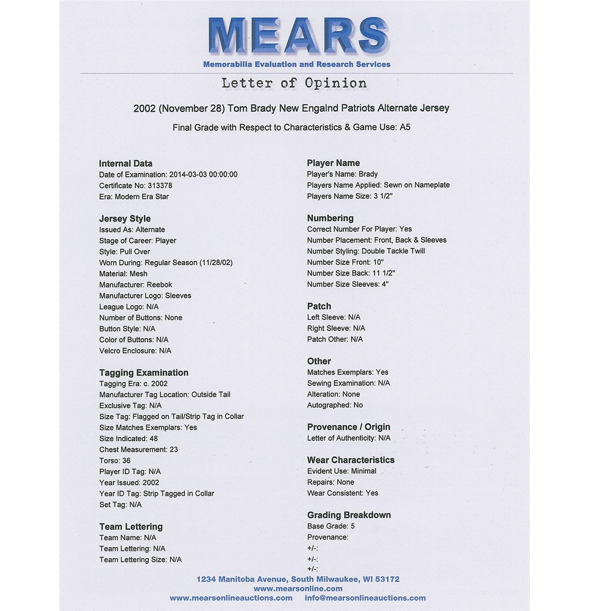 Brady’s special game-worn official Reebok ‘Turn Back the Clock’ New England Patriots jersey worn for only one game on Thanksgiving Day in 2002, when the Patriots defeated the Detroit Lions in a 20-12 victory. The red mesh jersey features his number “12” on the chest and back, with “Brady” across the shoulder area; both sleeves also have “12” and a Reebok patch. The correct Reebok manufacturer’s tag is sewn to the front left tail, with an adjacent flag tag indicating the size, “48.” The white strip tag sewn inside the back collar reads “02-48,” consistent with most other Reebok Patriots game-used jerseys. The jersey shows light wear, most notably on the front numbers, appropriate for single-game use. Accompanied by three photos showing Brady wearing this exact jersey during the 2002 Thanksgiving Day game, and letters of opinion from Mears and noted jersey expert Dave Miedema, with Mears evaluating it at a grade of A5 with respect to characteristics and game use. Game-used jerseys from this early point in his career are rare, with this being an especially appealing example due to its rare throwback design.