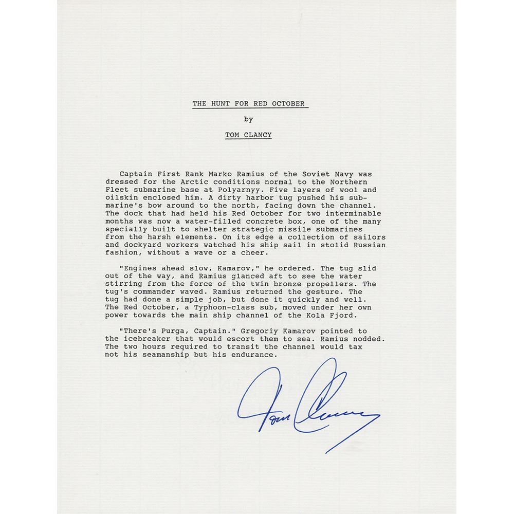 Souvenir typescript of an excerpt from The Hunt for Red October, one page, 8.5 x 11, signed at the bottom in blue felt tip by the acclaimed political thriller author, "Tom Clancy." In fine condition.