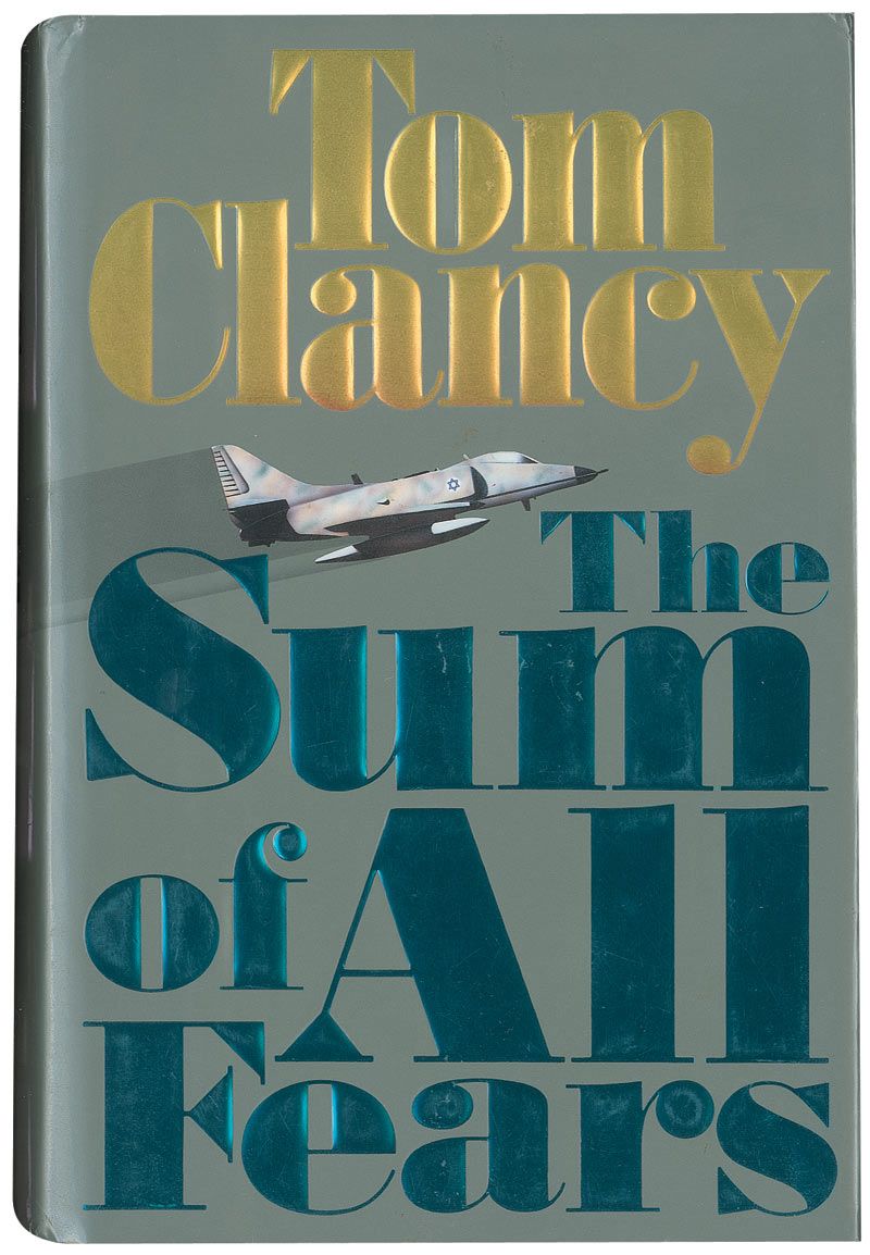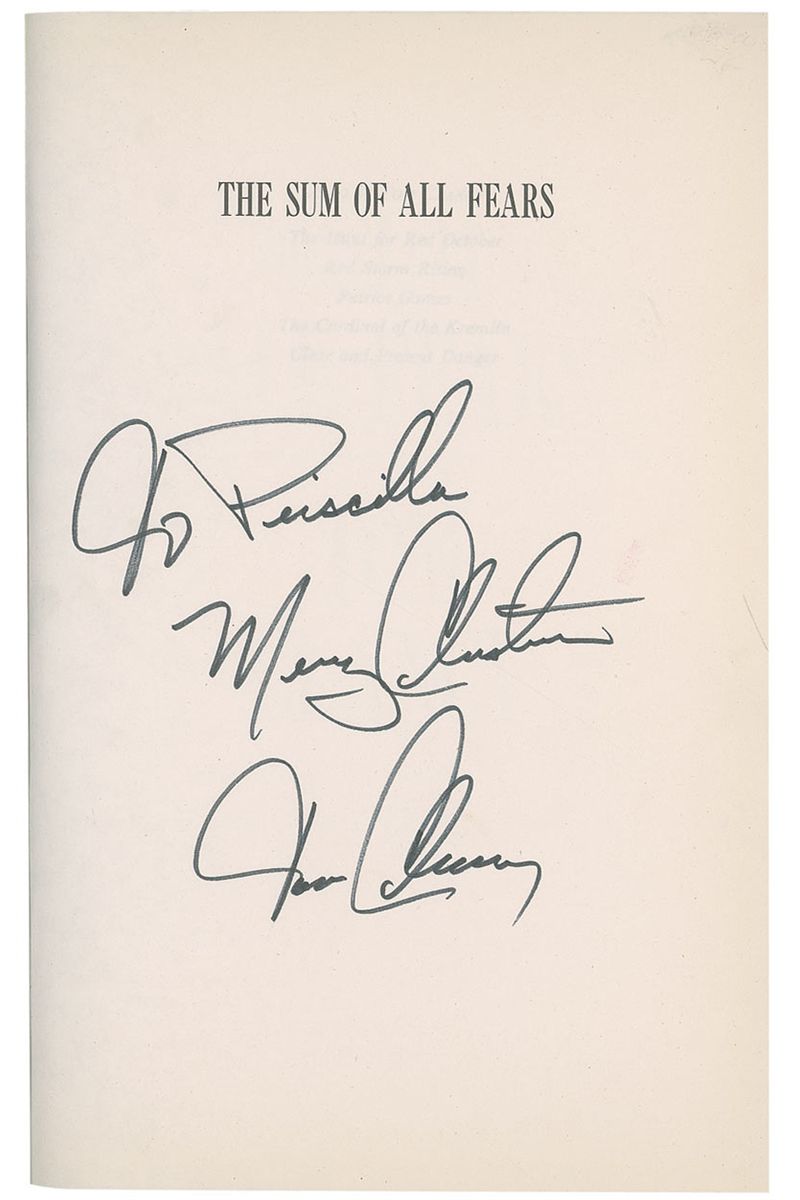 Signed book: The Sum of All Fears. Later printing. NY: G.P. Putnam’s Sons, 1991. Hardcover with dustjacket, 6.25 x 9.25, 796 pages. Signed and inscribed on the half-title page, “To Priscilla, Merry Christmas, Tom Clancy.” In fine condition, with some light toning to fore-edges and some scattered light wear and creasing to dustjacket.