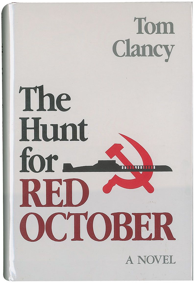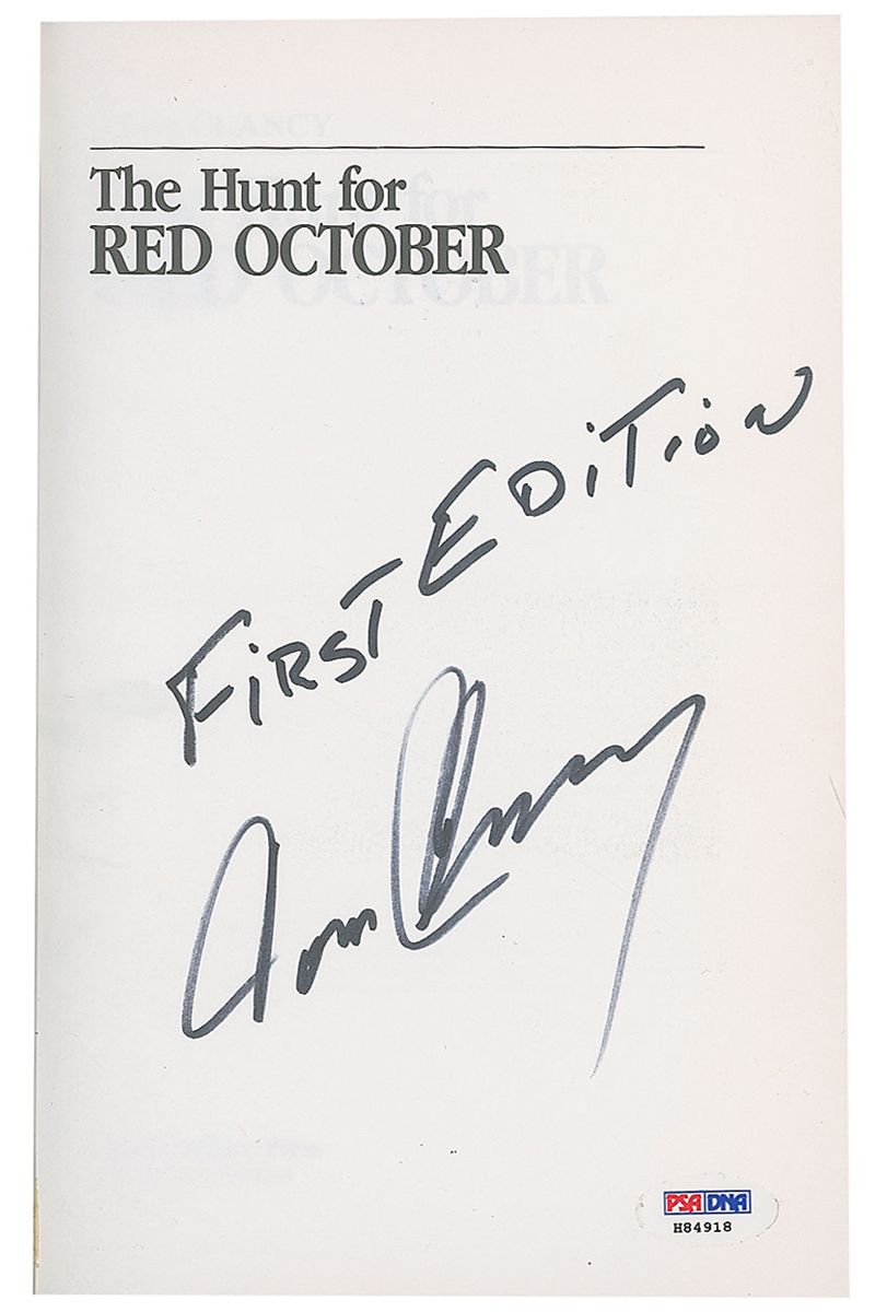 Signed book: The Hunt for Red October. First edition, first printing with dust jacket from a later printing. Annapolis: Naval Institute Press, 1984. Hardcover with dust jacket, 6.25 x 9.25, 387 pages. Signed on the half-title page in black felt tip, “First Edition, Tom Clancy.” Autographic condition: fine, with a PSA/DNA label affixed to lower right corner of half-title page. Book condition: VG/VG+. Red cloth-covered boards; light wear to edges, with board edges foxed (few spots on textblock edges as well); slightly shelf-cocked; boards slightly bowed. Dust jacket has only minor creases at corners and spine-ends.