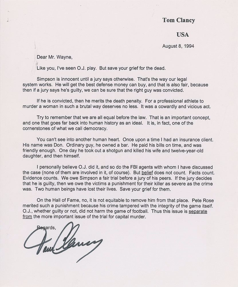 TLS, 8.5 x 10.25, personal letterhead, August 8, 1994. In full: "Like you, I've seen O.J. play. But save your grief for the dead. Simpson is innocent until a jury says otherwise. That's the way our legal system works. He will get the best defense money can buy, and that is also fair, because then if a jury says he's guilty, we can be sure that the right guy was convicted. If he is convicted, then he merits the death penalty. For a professional athlete to murder a woman in such a brutal way deserves no less. It was a cowardly and vicious act. Try to remember that we are all equal before the law. That is an important concept, and one that goes far back into human history as an ideal. It is, in fact, one of the cornerstones of what we call democracy. You can't see into another human heart. Once upon a time I had an insurance client. His name was Don. Ordinary guy, he owned a bar. He paid his bills on time, and was friendly enough. One day he took out a shotgun and killed his wife and twelve-year-old daughter, and then himself. I personally believe O.J. did it, and so do the FBI agents with whom I have discussed the case (none of them are involved in it, of course). But belief does not count. Facts count. Evidence counts. We owe Simpson a fair trial before a jury of his peers. If the jury decides that he is guilty, then we owe the victims a punishment for their killer as severe as the crime was. Two human beings have lost their lives. Save your grief for them. On the Hall of Fame, no, it is not equitable to remove him from that place. Pete Rose merited such a punishment because his crime tampered with the integrity of the game itself. O.J., whether guilty or not, did not harm the game of football. Thus this issue is separate from the more important issue of the trial for capital murder." In fine condition.