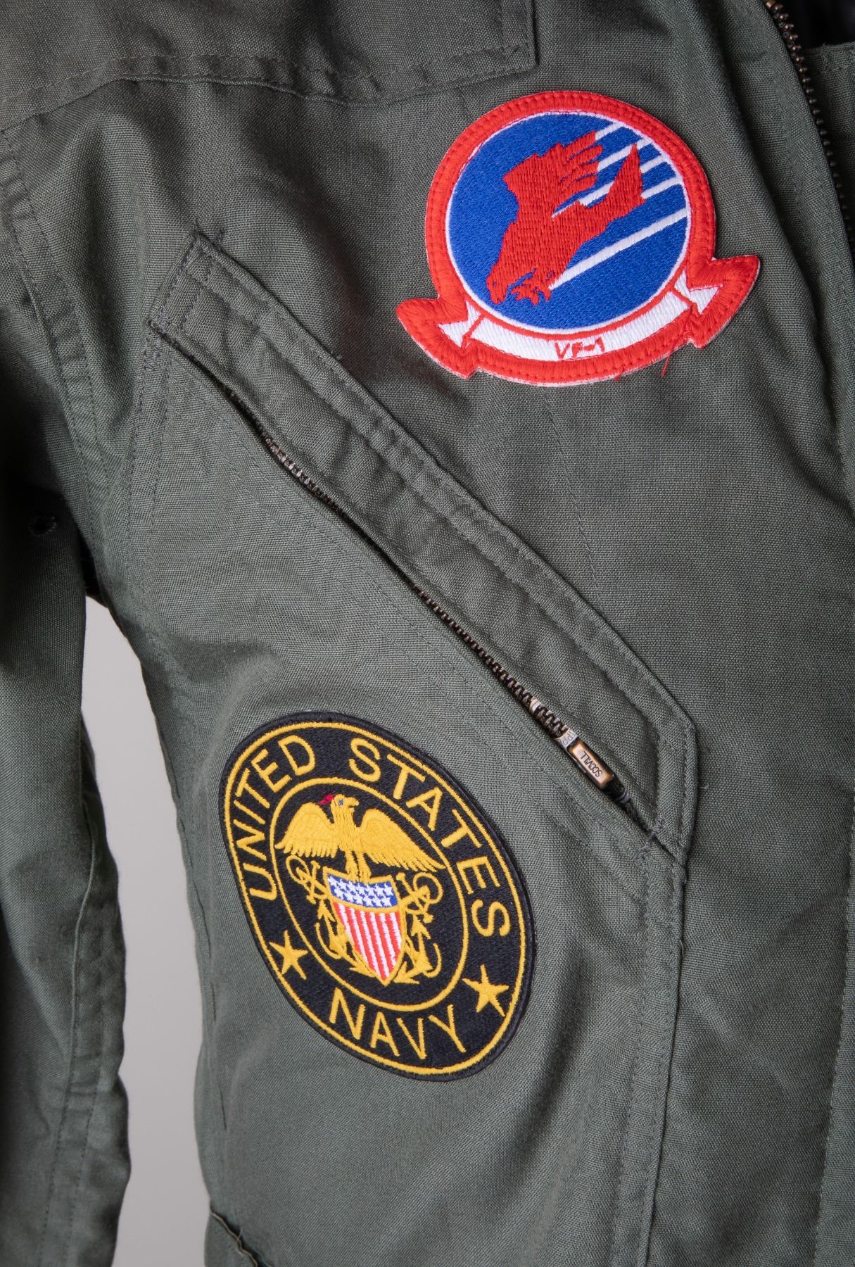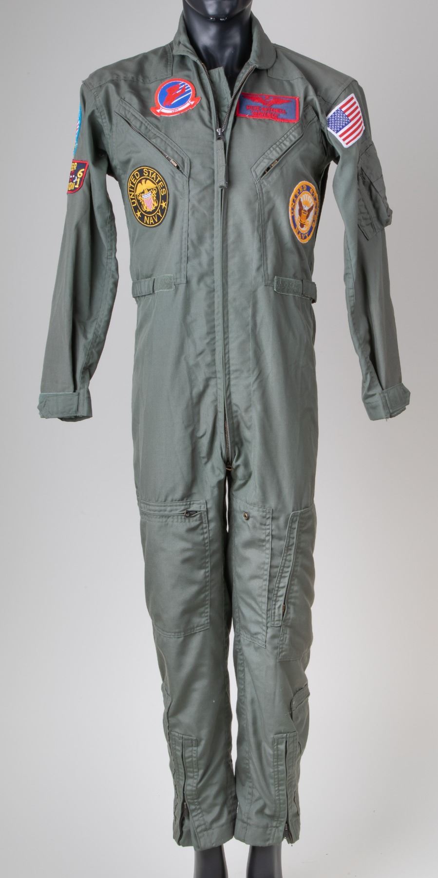 Pete 'Maverick' Mitchell's (Tom Cruise) flight suit from Tony Scott's action film “Top Gun”. Maverick wore his flight suit during aerial operations with the US Navy's Fighter Weapons School and on board the carrier USS Enterprise. The military-issue flight suit is made of sage green material, with a long zipper running down the front and adjustable waistbands fastened with Velcro at the hips. Zips and pockets are present along the legs, chest and arms. A manufacturer's label within is marked as size 38 Regular. The name “T. Cruise” is written on the inside. This Tom Cruise ‘Maverick” flight suit is the first one ever to come to auction with all of the original patches intact including the Tomcat patch, the United States Navy patch and the VF-1 fighter squadron patch. Maverick's name patch is attached to the left breast with Velcro and is sewn over (with parts of the original Velcro visible).