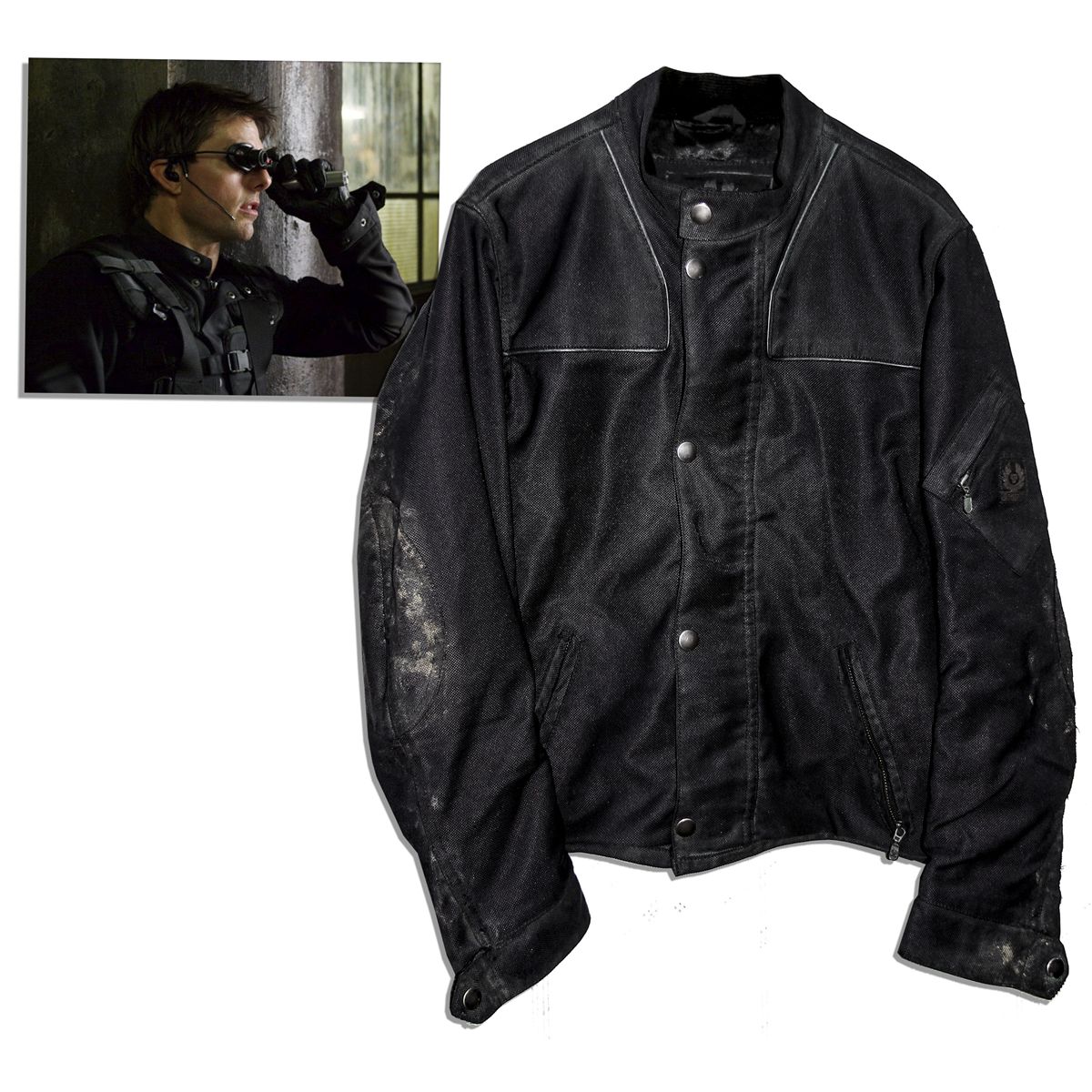 Tom Cruise costume from ''Mission Impossible III''. Cruise reprises his role as IMF agent Ethan Hunt in the third installment of the hit franchise. Costume comprises a fully lined heavyweight black cotton jacket by Belstaff in approximate size S, measuring 17'' across the chest, accompanied by a small earpiece and microphone apparatus procured by production. Light soiling to right sleeve of jacket and to the back, likely production caused, else near fine.