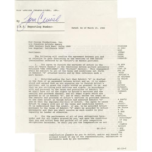 <B>Tom Cruise Signed "The Outsiders" Contract.</B></I> A three-page contract dated March 15, 1982, engaging a (then) virtually unknown Tom Cruise to appear as "Steve Randle" in Francis Ford Coppola's adaptation of S.E. Hinton's classic book. Signed on the last page by Cruise in blue ink, the contract is in Excellent condition with minimal wear.<I>Accompanied by LOA from PSA/DNA.</B></I><BR><BR><b>Shipping:</b> Small Flat (<a target="_blank" href="http://www.heritageauctions.com/common/shipping.php">view shipping information</a>)