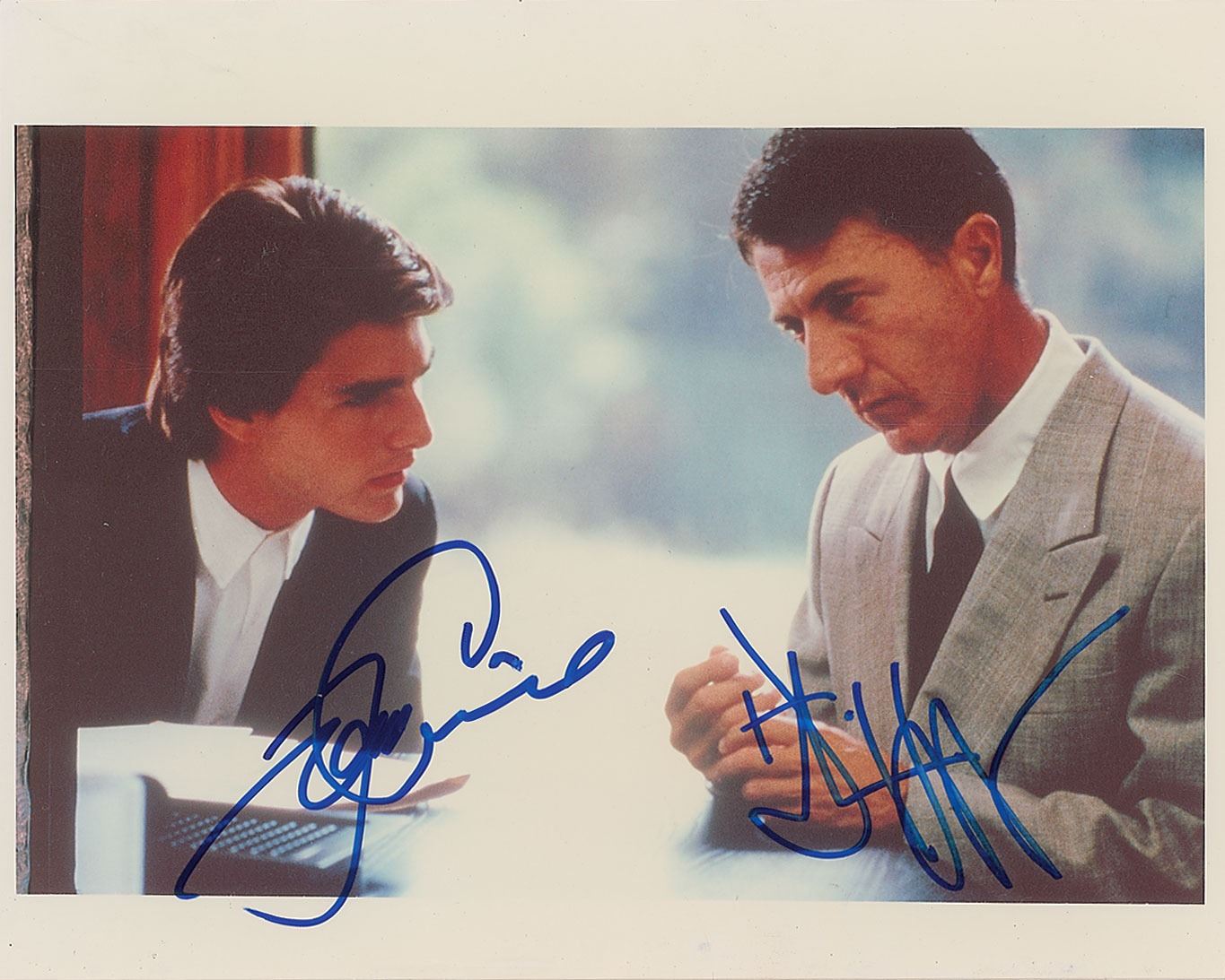 Color glossy 10 x 8 photo of Dustin Hoffman and Tom Cruise as Ray and Charlie Babbitt in the Oscar-winning 1988 comedy drama Rain Man, signed in blue felt tip by both leading men. In fine condition. Originally obtained by in-person specialist Mike Wehrmann.