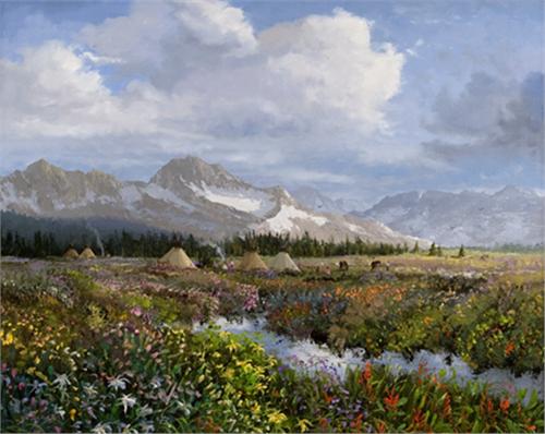Tom De Decker (b. 1951). Encampment Below Eagle Ridge. 24" x 30" oil on canvas. Signed lower left. (est $6,000-7,000)