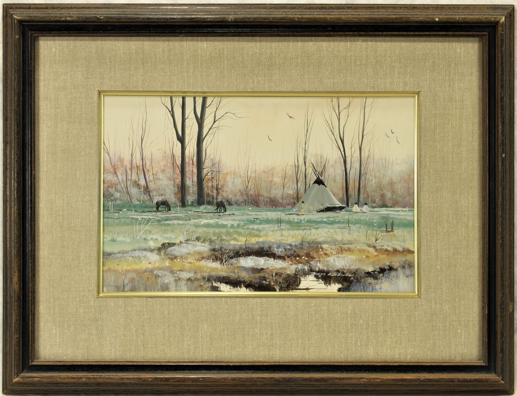 Titled "A Land Abounding in Beauty and Warmth-Pawnee", a 9"x 14" gouache, signed in lower right.