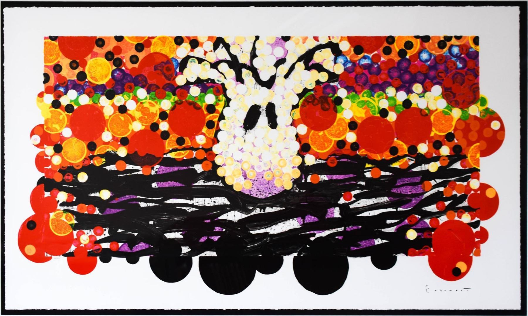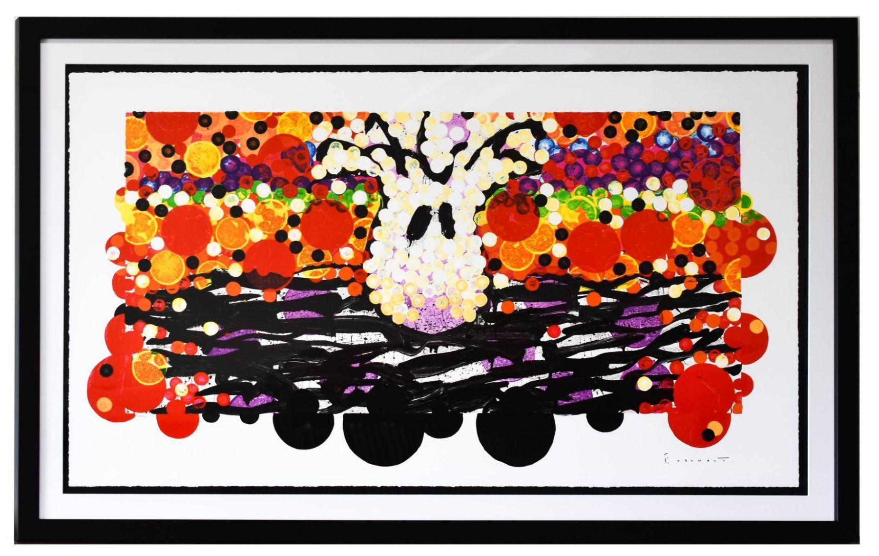 Artist: Tom Everhart. Medium: Hand Pulled Original Lithograph. Title: Calmly Insane In My Nest. Size (Unframed): 32" x 55". Size (Framed): 40" x 63". Limited Edition: Numbered 263/500. Certificate of Authenticity: From the publisher. Additional: "Calmly Insane In My Nest" is a limited edition hand pulled original lithograph on museum quality deckle-edge paper, numbered and hand signed by Tom Everhart. This is one of the final Everhart editions to be created on a rare, antique Marinoni Voirin lithograph press that dates back to the 1800's.. Reference# 11861.