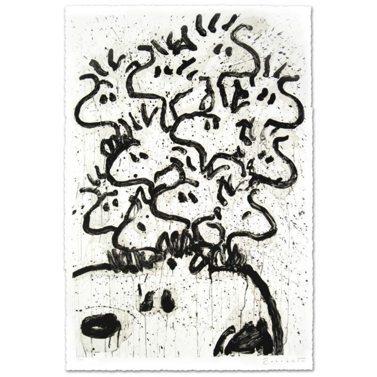 Artist: Tom Everhart. Medium: Hand Pulled Original Lithograph. Title: Party Crashers. Size (Unframed): 45.5" x 31". Certificate of Authenticity: Is included. Additional: Tom Everhart is the only artist with full creative rights to the "Peanuts" characters created by Charles M. Schulz (November 26, 1922 –February 12, 2000). In 1980 Tom graduated from the School of Art and Architecture at Yale University. He got a freelance job drawing renderings of Charles Schulz's characters. Everhart began working with "Peanuts" imagery exclusively. His first show was at the famous Louvre Museum in January 1990. In 1991, Charles Schulz and United Media, drafted a legal agreement allowing Tom exclusive rights to use subject matter from Schulz's "Peanuts" strip in his art for "the term of his life". "Peanuts" is the most popular and influential strip in the history of the genre, and ultimately earned Schulz over $1 billion during his lifetime. His decision to tap Everhart as the sole steward of his creation is an honor that the artist has happily devoted his life to.. Reference# 11197.