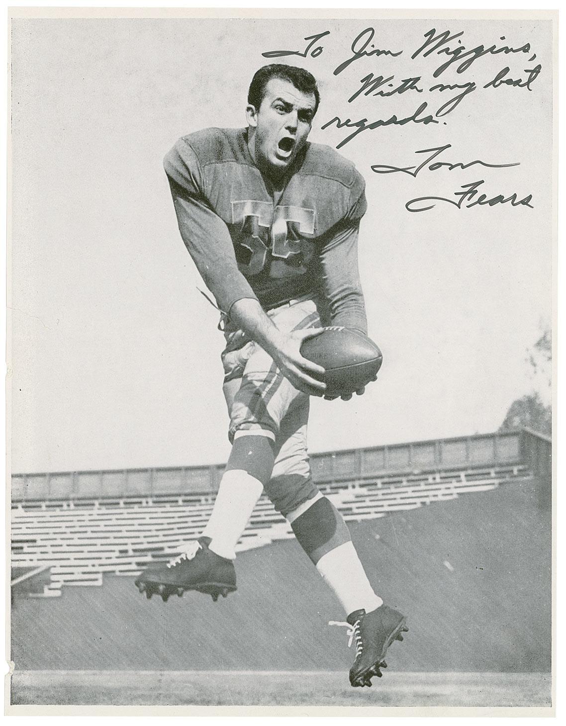 Pro and College Football Hall of Famer (1922–2000). Paperstock 8 x 10 photo of Fears in his Rams uniform, signed and inscribed in black felt tip “To Jim Wiggins, with my best regards, Tom Fears.” In very good condition, with a couple tears to left side, as well as binder dings, and a light central horizontal crease.