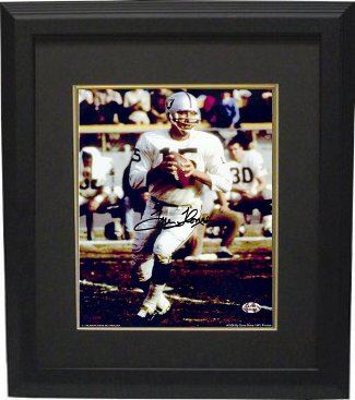 In 1960 Tom Flores finally landed a position as a quarterback with the American Football League's Oakland Raiders, who began play in 1960 as a charter member of the league. He was named the Raiders' starting quarterback early in the 1960 season, becoming the first Hispanic starting quarterback in professional football history. Flores had his most productive season in 1966. Although he completed only 49.3 percent of his attempts, he passed for 2,638 yards and 24 touchdowns in 14 games. He is the fifth-leading passer, all-time, in the AFL. Tom Flores has hand signed this Oakland Raiders 8x10 Photo. The photo was signed 11/24/07 in San Francisco, CA. RS Hologram and Certificate of Authenticity from Athlon Sports. Custom Black Mat and Premium Black Frame as shown