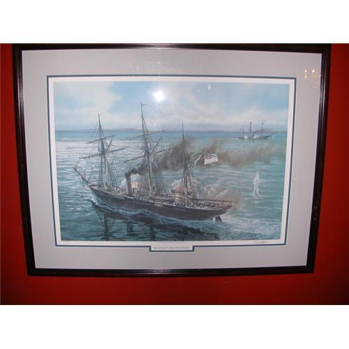 A limited edition artist signed and numbered print titled "Sunday Showdown" by Tom Freeman, ca. 1994. The print depicts the C.S.S. Alabama engaging the U.S.S. Kearsarge off Cherbourg, France on Sunday, June 19, 1864. The print is artist signed and numbered 115 of 750 prints. It is professionally framed and matted. It measures 37 x 29 inches. Shipping quoted upon sale.