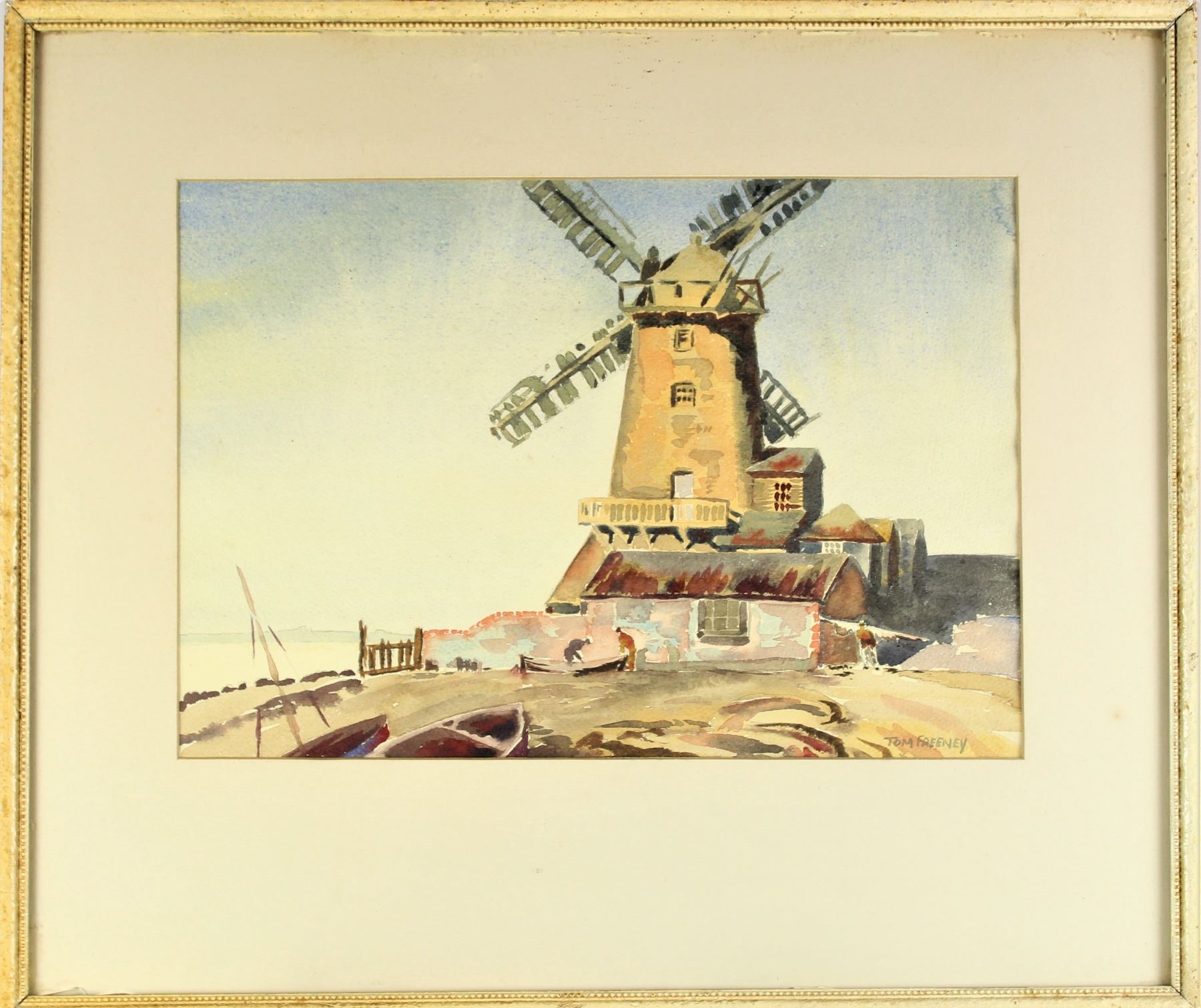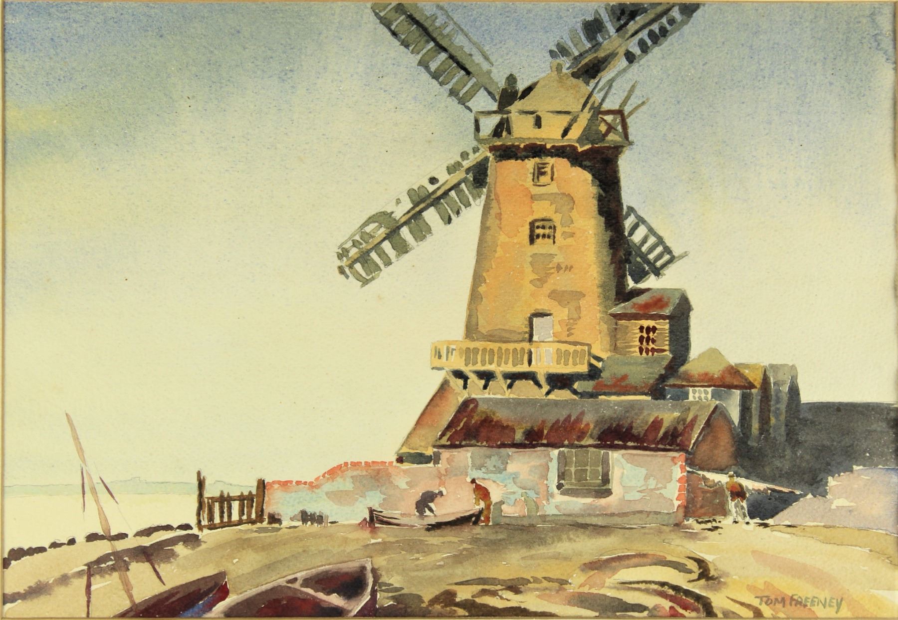 Watercolor of a windmill on a coast with fishing boats on the shore and men working.