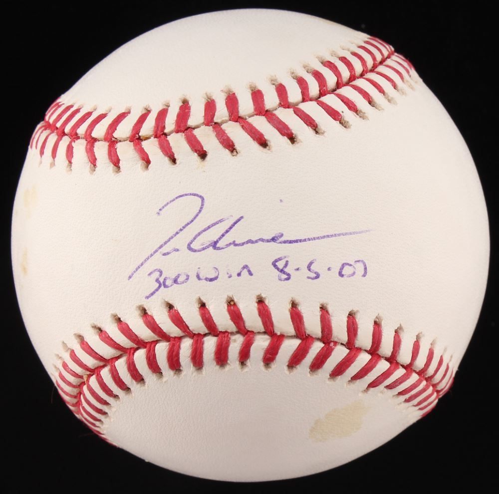 Rawlings Official Major League Baseball. Hand-signed and inscribed in blue ink pen by Tom Glavine (Mets, HOF). Please note, the baseball shows signs of natural toning.