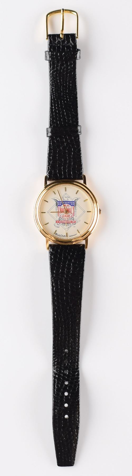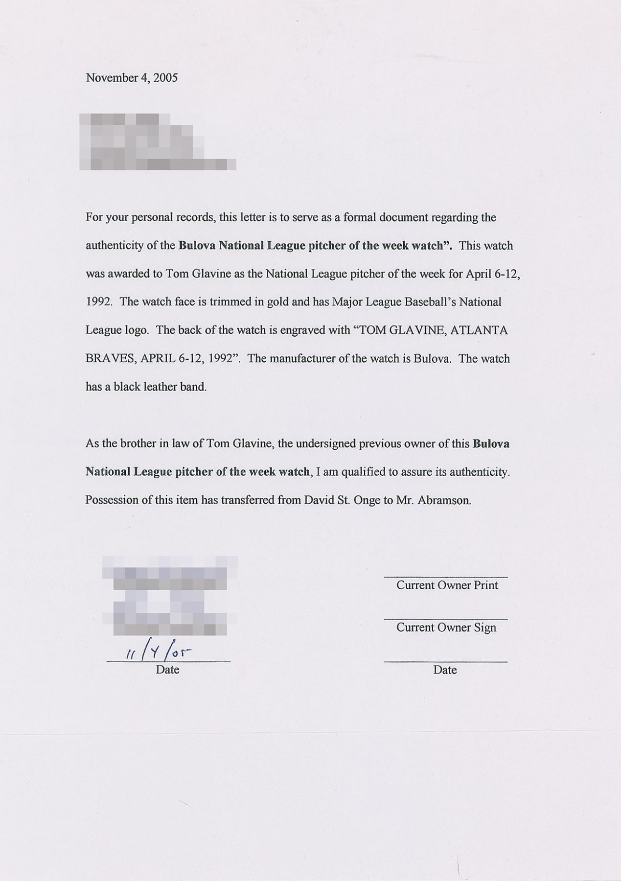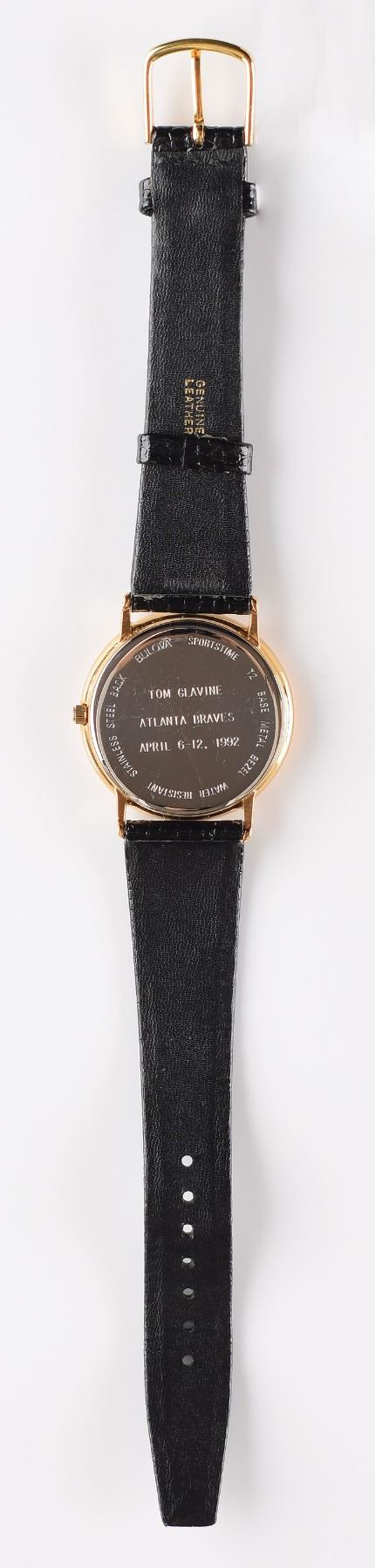 Tom Glavine's Bulova wristwatch awarded to him as the National League's 'Pitcher of the Week' for April 6–12, 1992, featuring a white face imprinted with the NL logo, gold-tone hands and case, and black strap. The caseback is engraved, "Tom Glavine, Atlanta Braves, April 6–12, 1992." In fine condition. Accompanied by a blue presentation box and a letter of provenance from Glavine's brother-in-law. Following his Cy Young Award–winning campaign in 1991, Glavine opened up the 1992 season with a complete game shutout of the Houston Astros on April 7th, then gave up just one earned run in 8.1 innings on April 12th. Over the course of these 17.1 innings, he struck out 15 batters while walking just two.