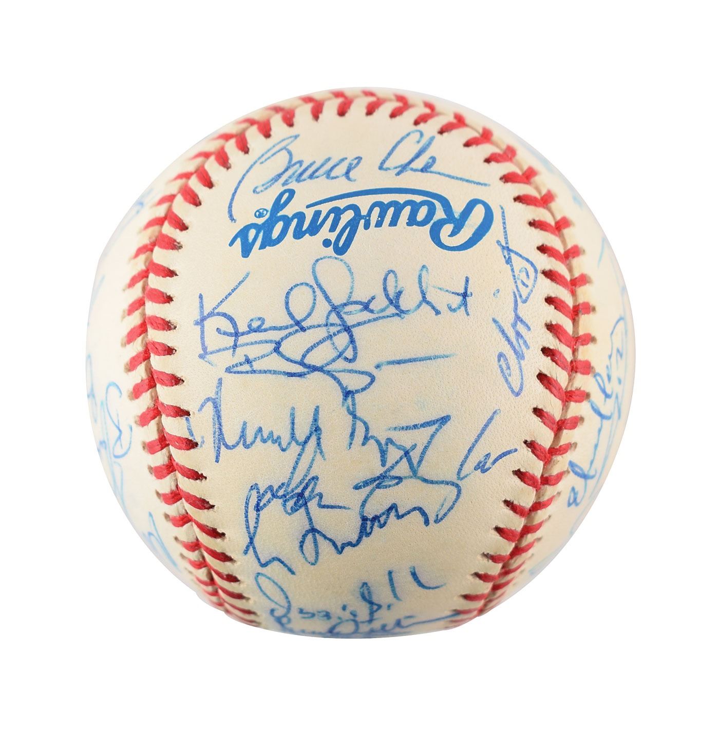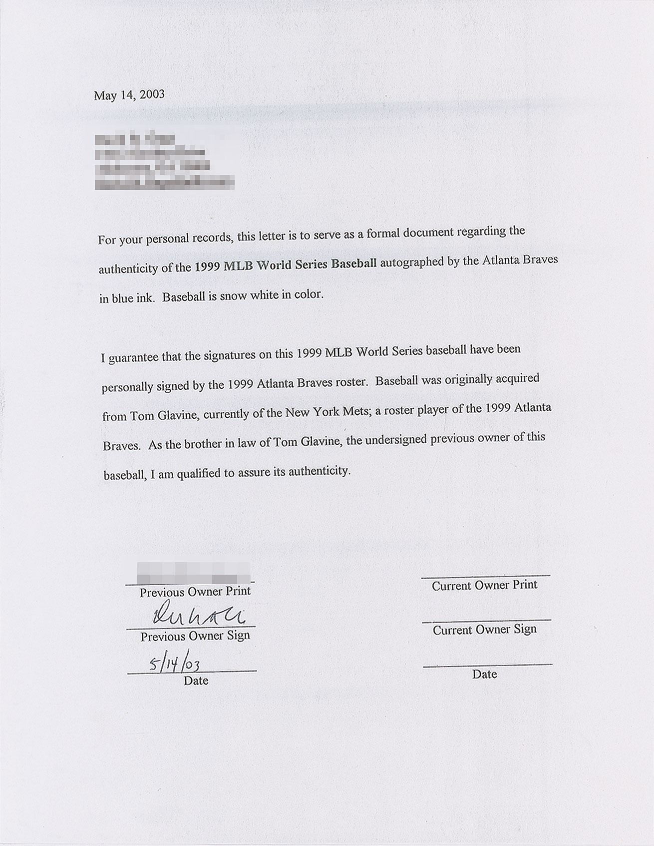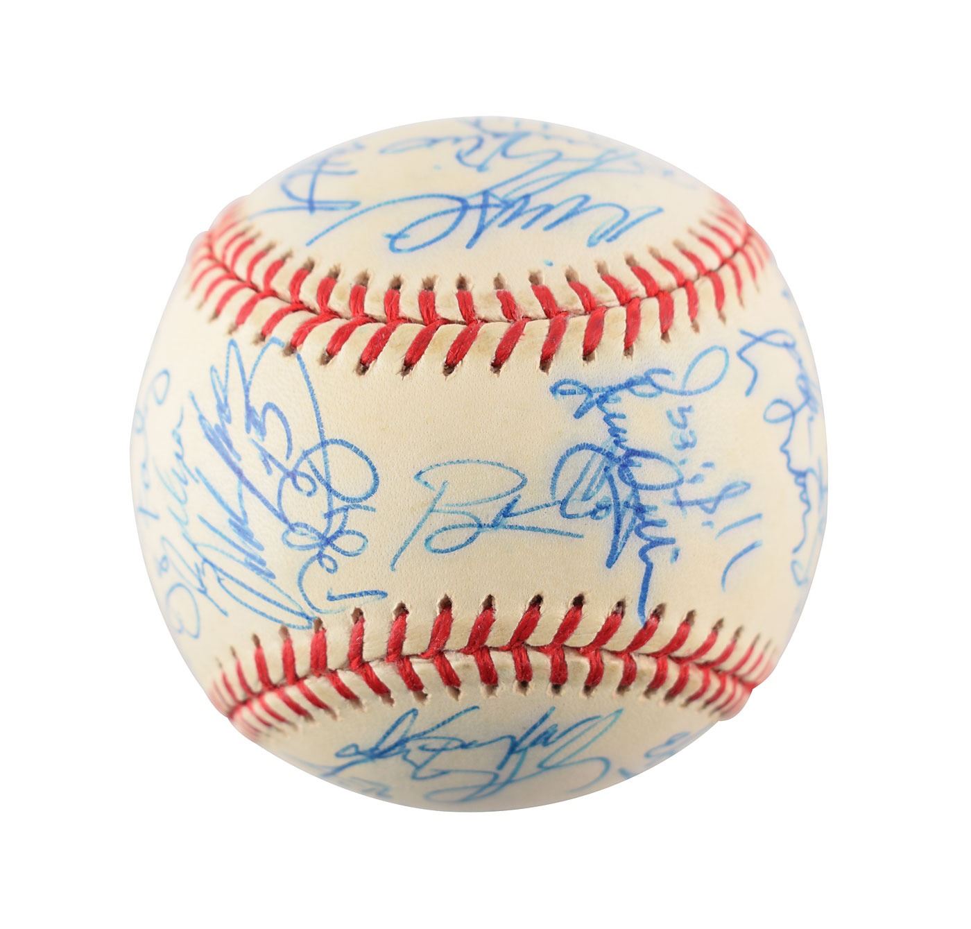 Official Rawlings 1999 World Series baseball signed in blue ballpoint on the sweet spot and side panels by 34 members of the National League champion Atlanta Braves, including: Greg Maddux, Chipper Jones, Tom Glavine, Bobby Cox (ss), Brian Jordan, Mike Remlinger, Keith Lockhart, Bruce Chen, Ozzie Guillen, Bret Boone, and many more. In fine condition. Accompanied by a letter of provenance from Glavine's brother-in-law.