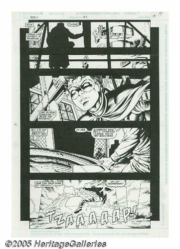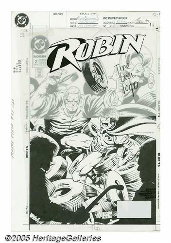 <B>Tom Grummett and Ray Kryssing - Robin #2 Cover and Pages, Group of 18 (DC, 1993).</B></I> Robin takes on Shotgun Smith, the Speedboyz, Mr. Badwrench, and the Cluemaster in these hard-hitting pages from <B>Robin</B></I> #2 . The Spoiler cameos in the final panel. The lot includes the cover and pages 1-3, 5-7, 10-14, and 16-22. The image area of each page is approximately 10" x 15", and the art is in Excellent condition.
