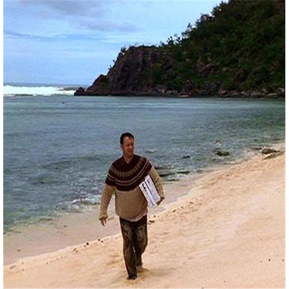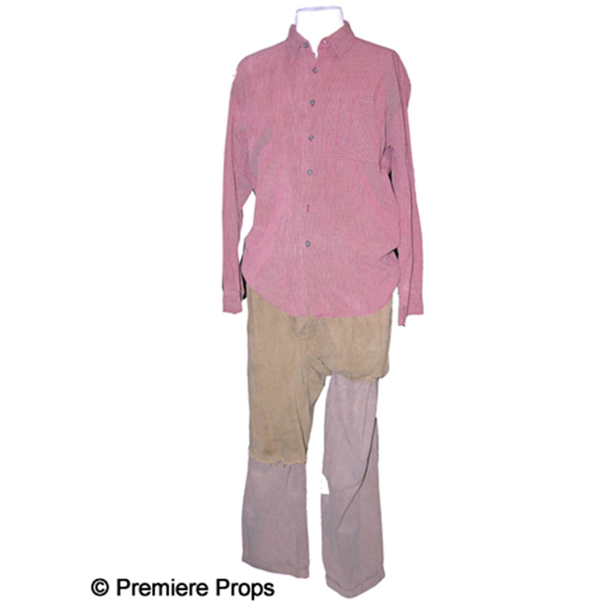 Screen worn shirts and pants, worn by actor Tom Hanks in his Academy Award-nominated performance as Chuck Noland in Cast Away (2000). The film detailed this character's attempts to survive on a small, deserted island when his plane crashes over the ocean. His only friend was a volleyball named Wilson. This lot includes Hanks' red, button-down shirt with a Kenneth Cole label, his Polo by Ralph Lauren wool sweater, brown slacks with cutoff legs (worn in the desert island sequences) and dark tan slacks with a J. Peterman label on the inner lining. Sweater has studio-issued hangtag attached. Large, notable ensemble relating to this well-received film.