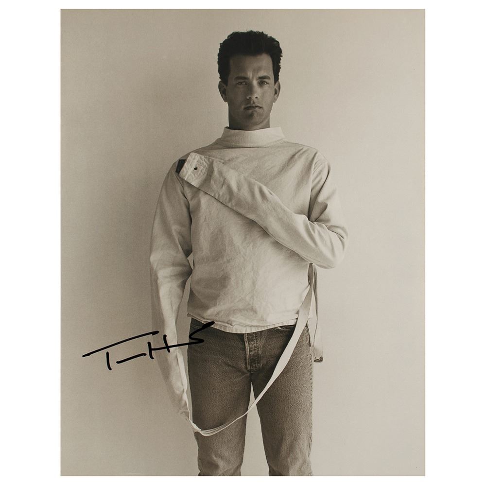 Oversized 11.5 x 14.75 paperstock photo of Tom Hanks removed from a portrait book, signed in black felt tip. In very fine condition.
