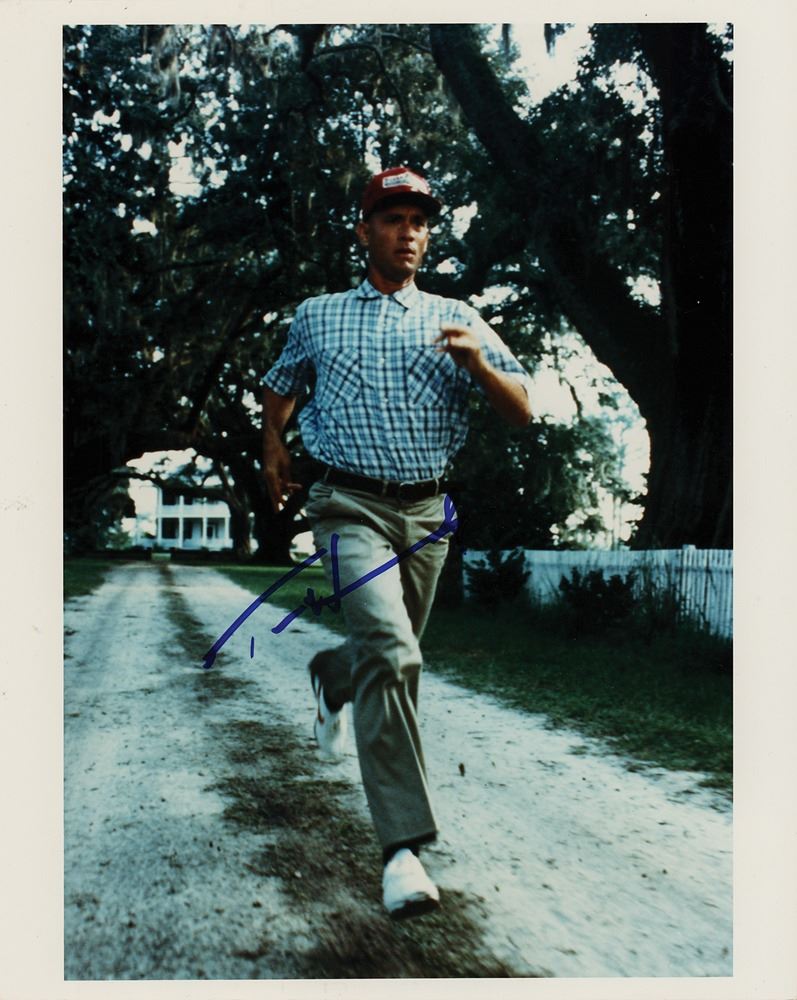 Color glossy 8 x 10 photo of Tom Hanks in his Oscar-winning role as Forrest Gump, signed in blue felt tip. In fine condition. Originally obtained by in-person specialist Mike Wehrmann.
