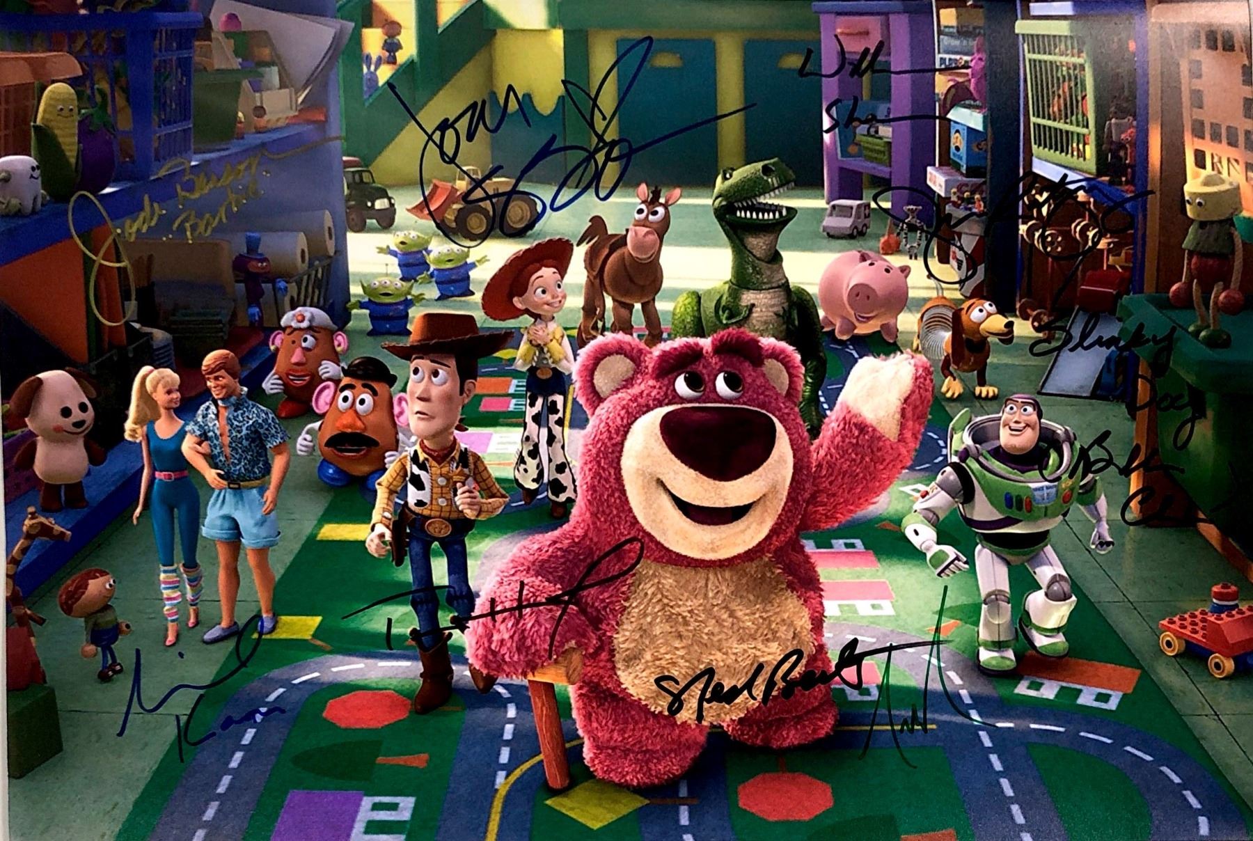 Autograph Includes: Tom Hanks, Tim Allen, Joan Cusack, Ned Beatty, Michael Keaton, Wallace Shawn, John Ratzenberger, Jodi Benson, Blake Clark