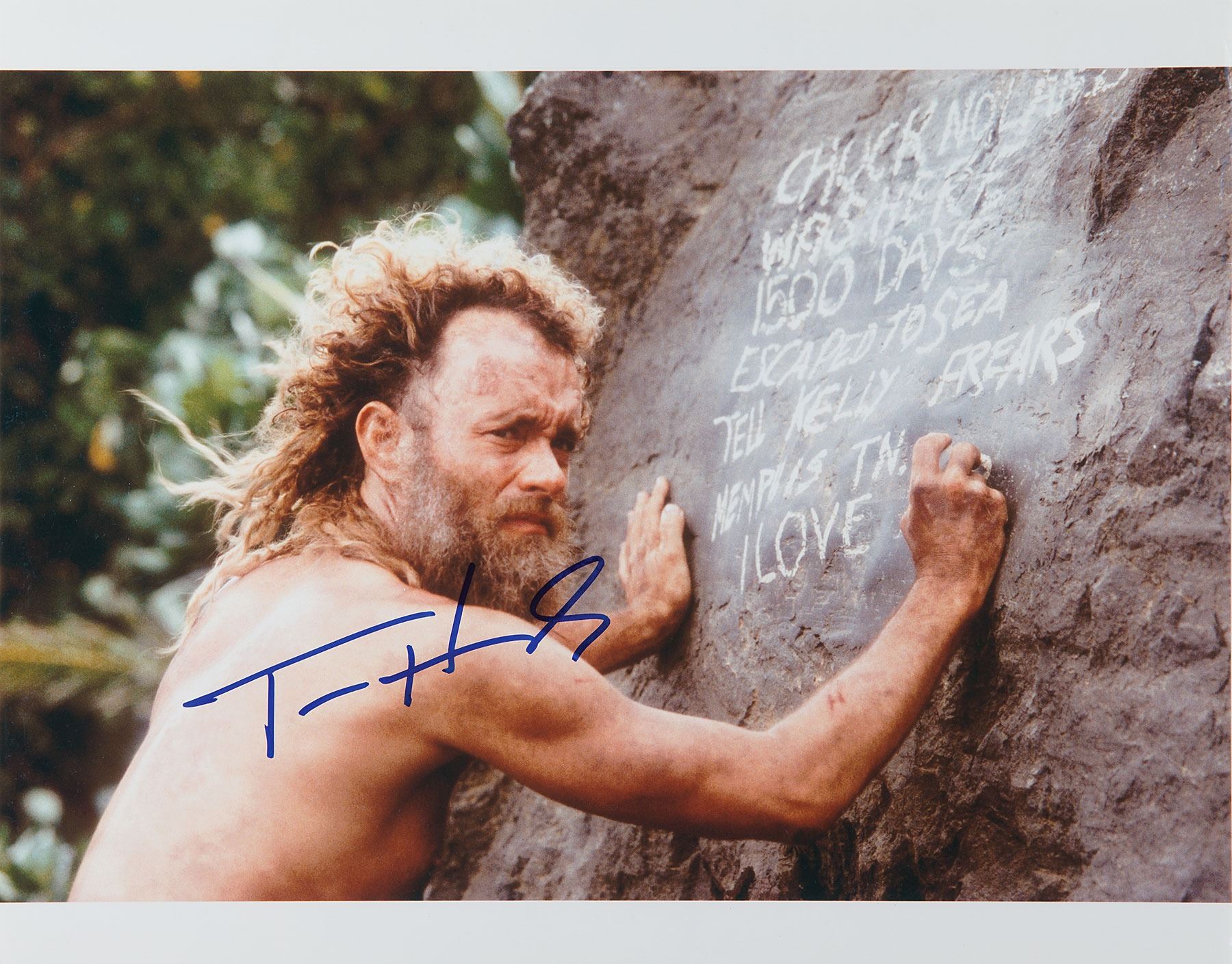 Color satin-finish 14 x 11 photo of Hanks stranded on an island in Cast Away, signed in blue felt tip. In fine condition. Originally obtained by in-person specialist Mike Wehrmann.