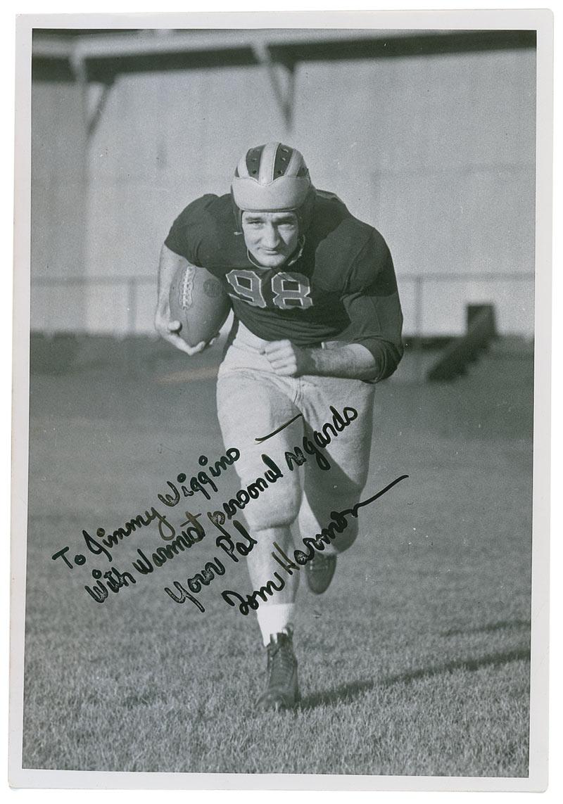 College Football Hall of Famer (1919–1990), winner of the 1940 Heisman trophy, and considered by some to be the greatest football player in Michigan Wolverines history. Glossy 4.75 x 7 photo of Harmon in his Michigan uniform, signed and inscribed in black ink “To Jimmy Wiggins—With warmest personal regards, Your pal, Tom Harmon.” Some scattered light creases and ripples, otherwise fine condition.
