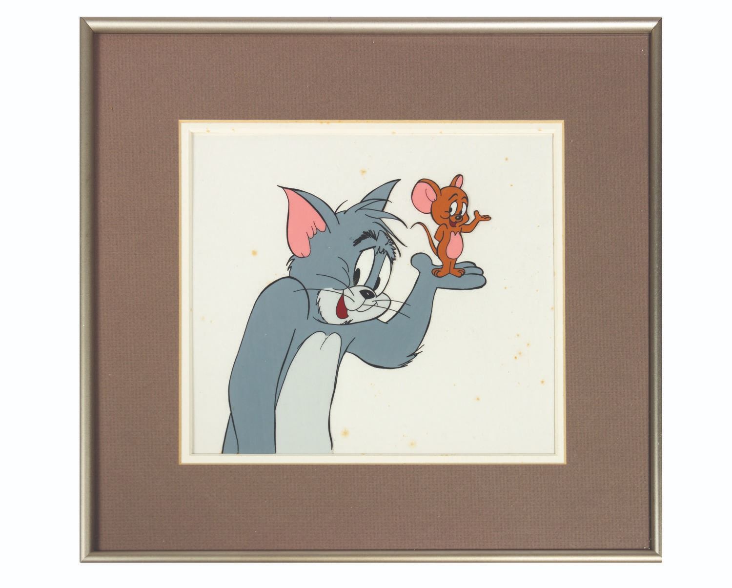 DESCRIPTION CORRECTION: (MGM, c.1960s) This is an original hand-painted Tom & Jerry promotional cel. Attributed to the Gene Deitch era of the MGM production, the iconic cat and mouse foes have called a truce in this cheerful composition. The cel has a character image size of 6.75"x7" viewable within a 13"x14" frame. The cel is in good condition with scattered spots of discoloration from age.