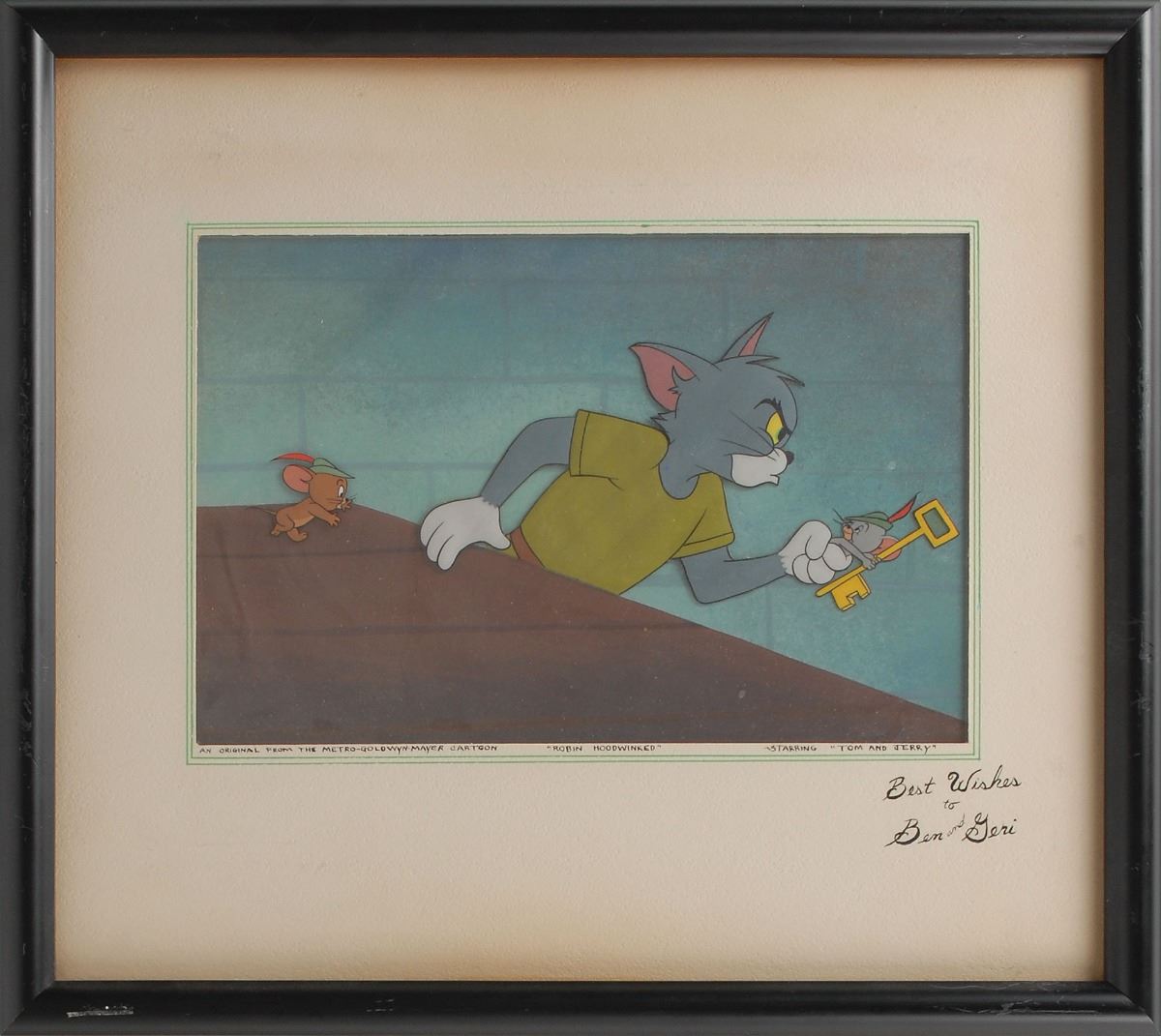 (MGM Studios, 1958) Original production key master background set-up featuring Tom, Jerry, and Tuffy from Robin Hoodwinked, displayed in its original MGM presentation mat. The cel is placed on a hand-painted production key master background. Character images measure 1.5 x 1.5 and 8 x 4.25 (Tom trimmed to image), with a mat opening of 11.5 x 7.5. This piece is also framed to an overall size of 17 x 15. In fine condition.