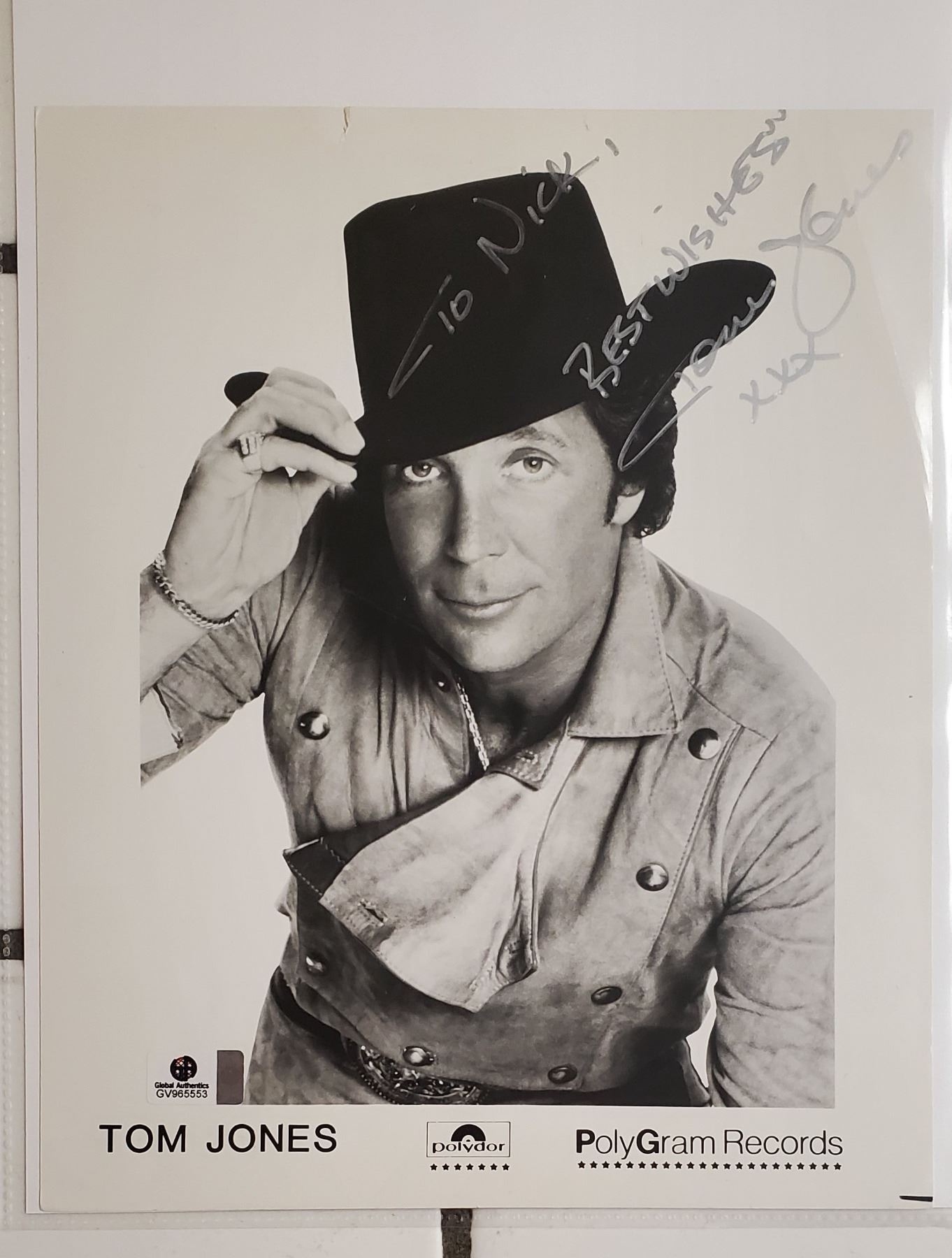An 8” x 10” photograph signed by Tom Jones. Global Authentics authenticated the autograph, providing a COA numbered GV 965553.