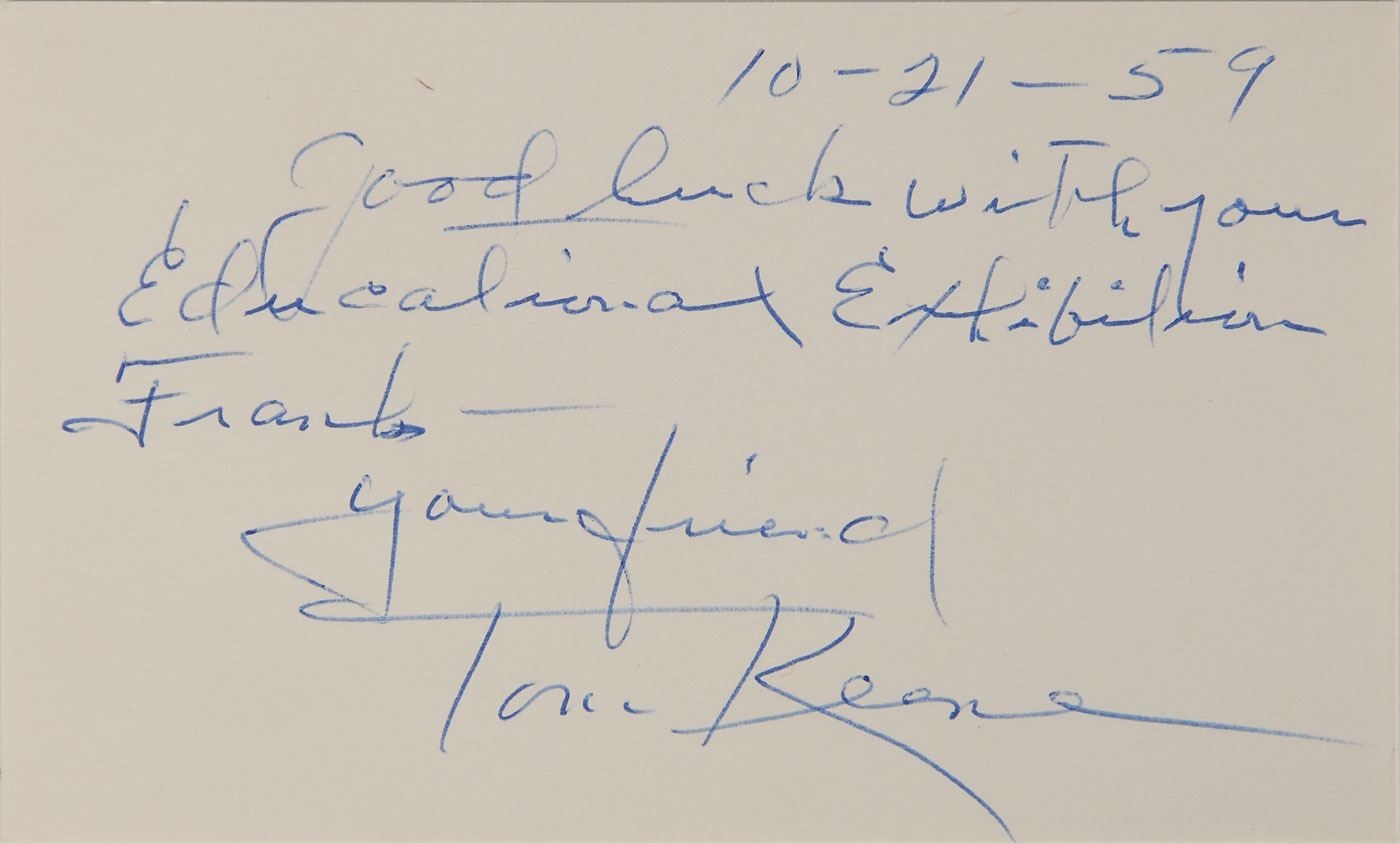 American actor (1896-1963) who earned a footnote in Hollywood history for his role as Col. Tom Edwards in the beloved Ed Wood 'classic' Plan 9 from Outer Space. Two items: a vintage glossy 8 x 10 publicity still of Keene rearing up his horse Rusty, signed and inscribed in fountain pen, "Good luck Frank, your friend, Tom Keene, 10-21-59"; and a ballpoint signature and inscription, "Good luck with your educational exhibition, Frank-your friend, Tom Keene, 10-21-59," on an off-white 5 x 3 card. In overall fine condition. Accompanied by the original mailing envelope hand-addressed by Keene, who signs his name in the return field. Keene remains quite scarce across all formats.