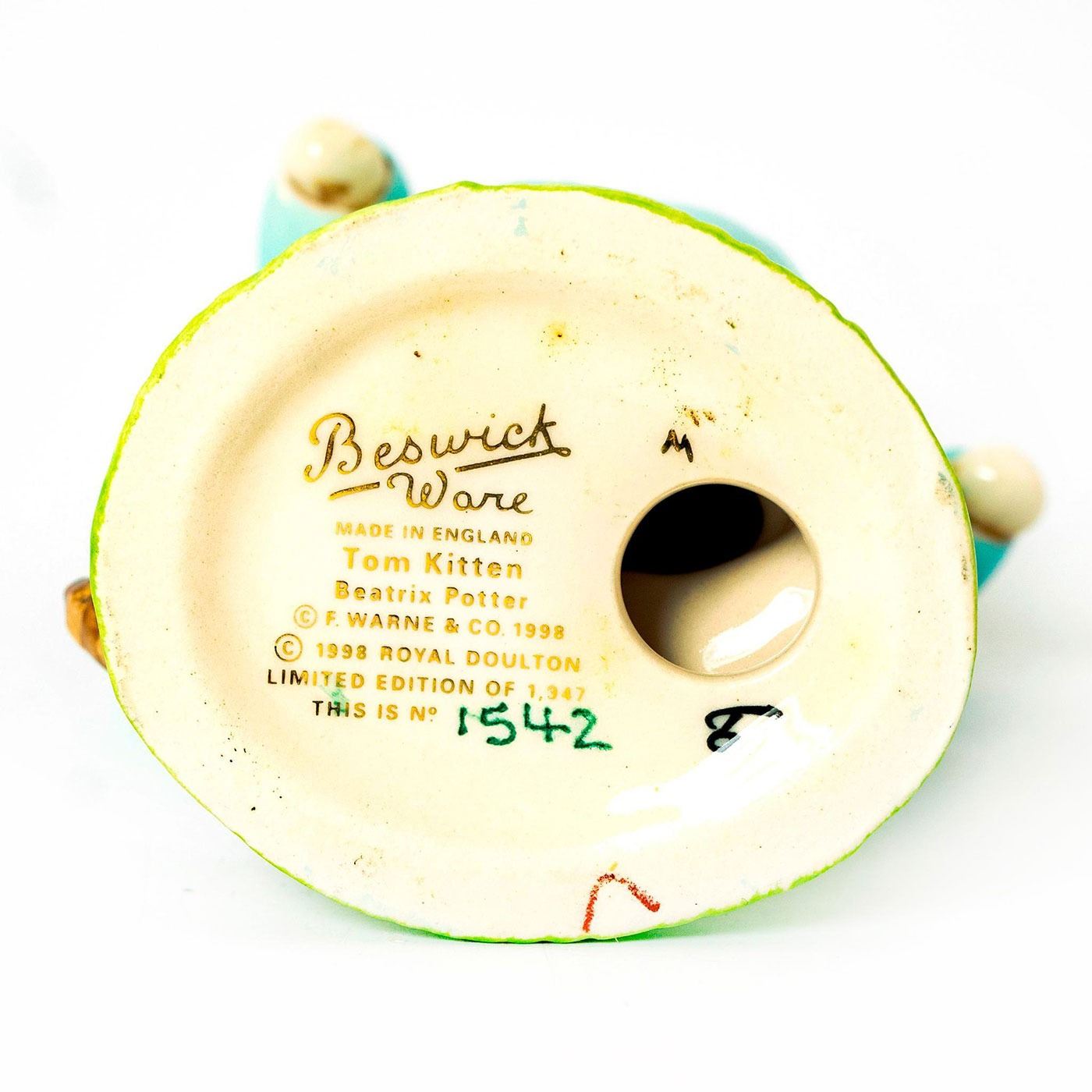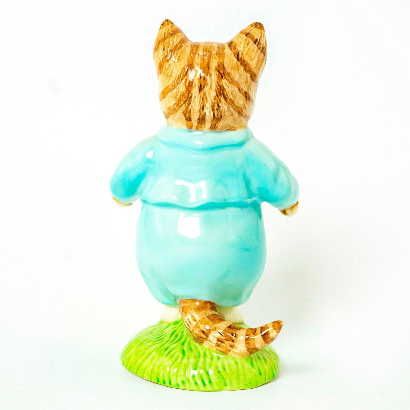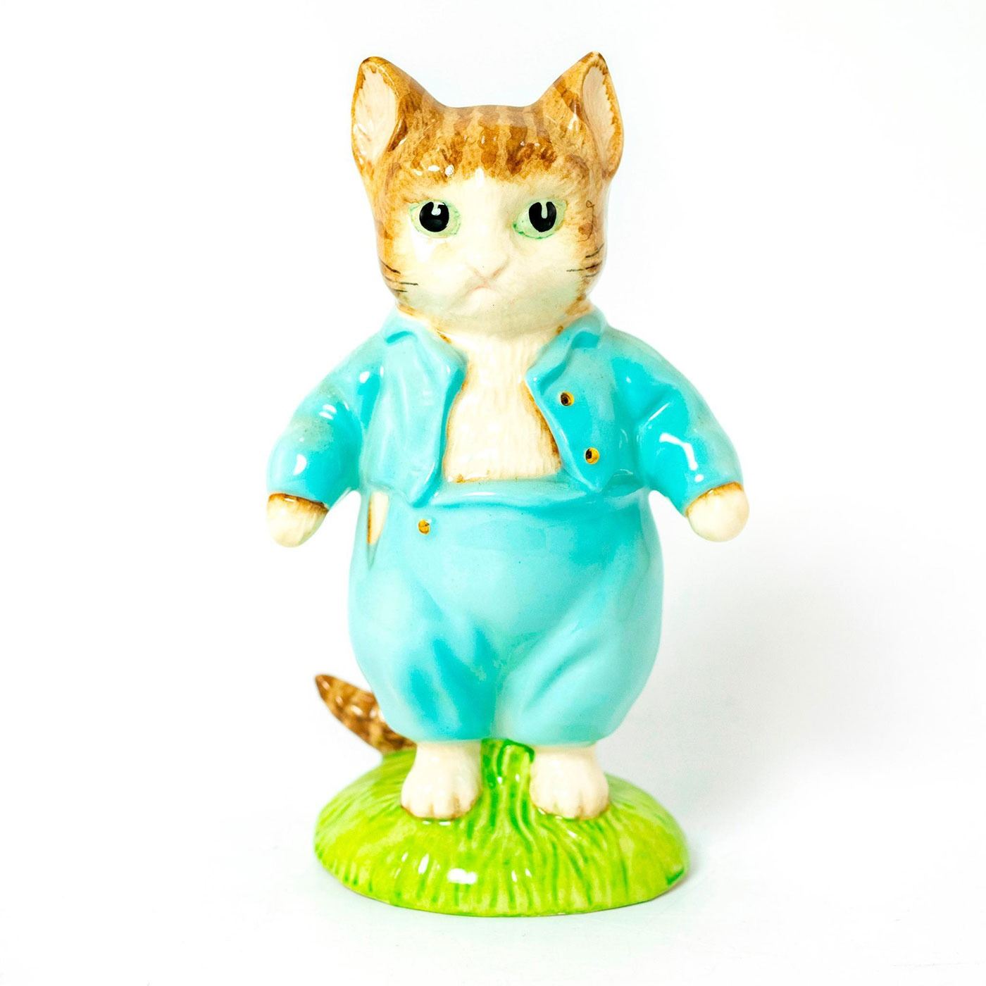 Beswick Backstamp. Large size. Tabby kitten wearing light blue jacket with gold button, and trousers, light green base.