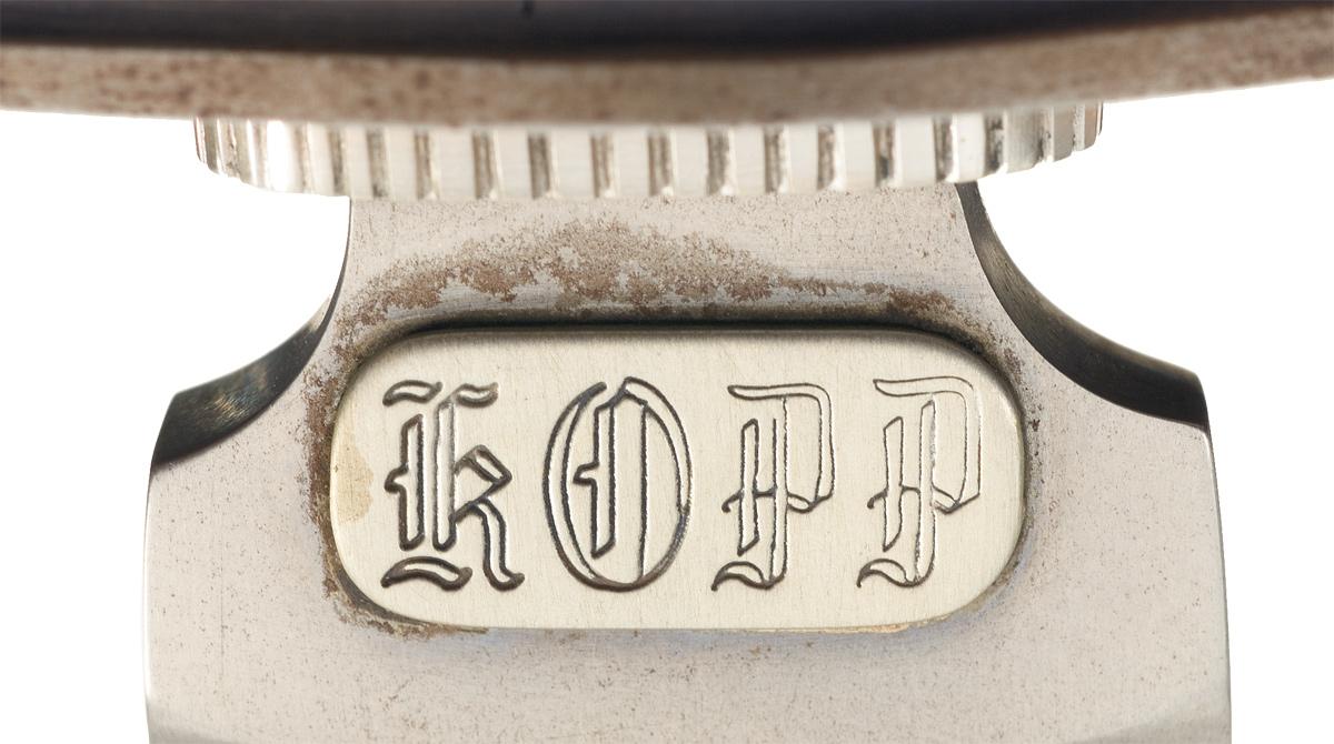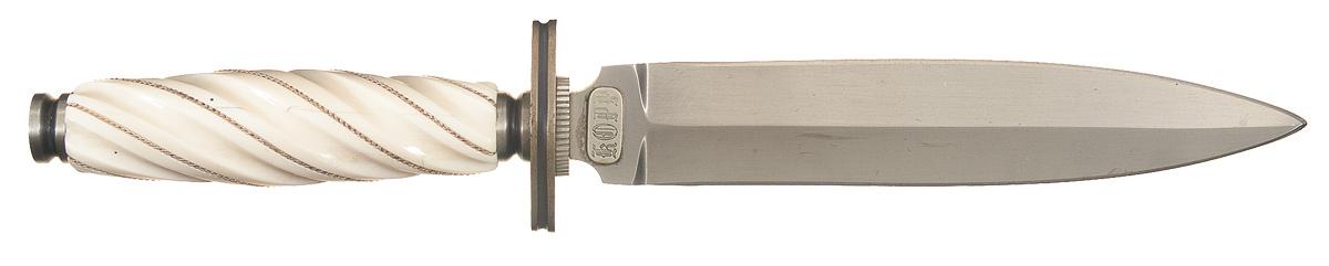 This is an example of a Tom M. Kopp handcrafted dagger. Tom M. Kopp began his knife making career in the late 1980s, and today specializes in classic and traditional straight knives and fluted handle daggers. His work has received several awards from the Arizona Knife Collectors Association and at his first knife show in 1991 received the "Most Promising New Maker" award. This Kopp dagger has a 7 1/4 inch blade with his traditional name plaque in Old English ("KOPP"). The steel oval guard has a grooved edge. The handle is fluted ivory with twisted silver wire and circular steel pommel. OAL: 12 1/4"