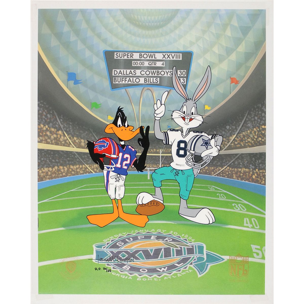 Limited edition hand-painted animation cel entitled ‘Super Bowl XXVIII,’ 14 x 17, numbered AP 16/25, showing Daffy Duck and Bugs Bunny in Buffalo and Dallas uniforms, signed in black felt tip by McKimson, and set against a pre-printed background. In very fine condition.