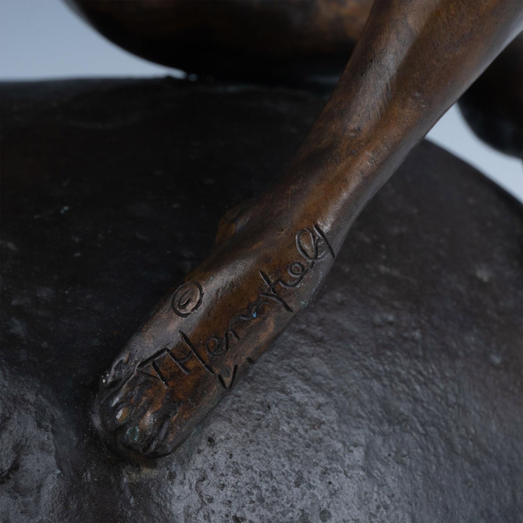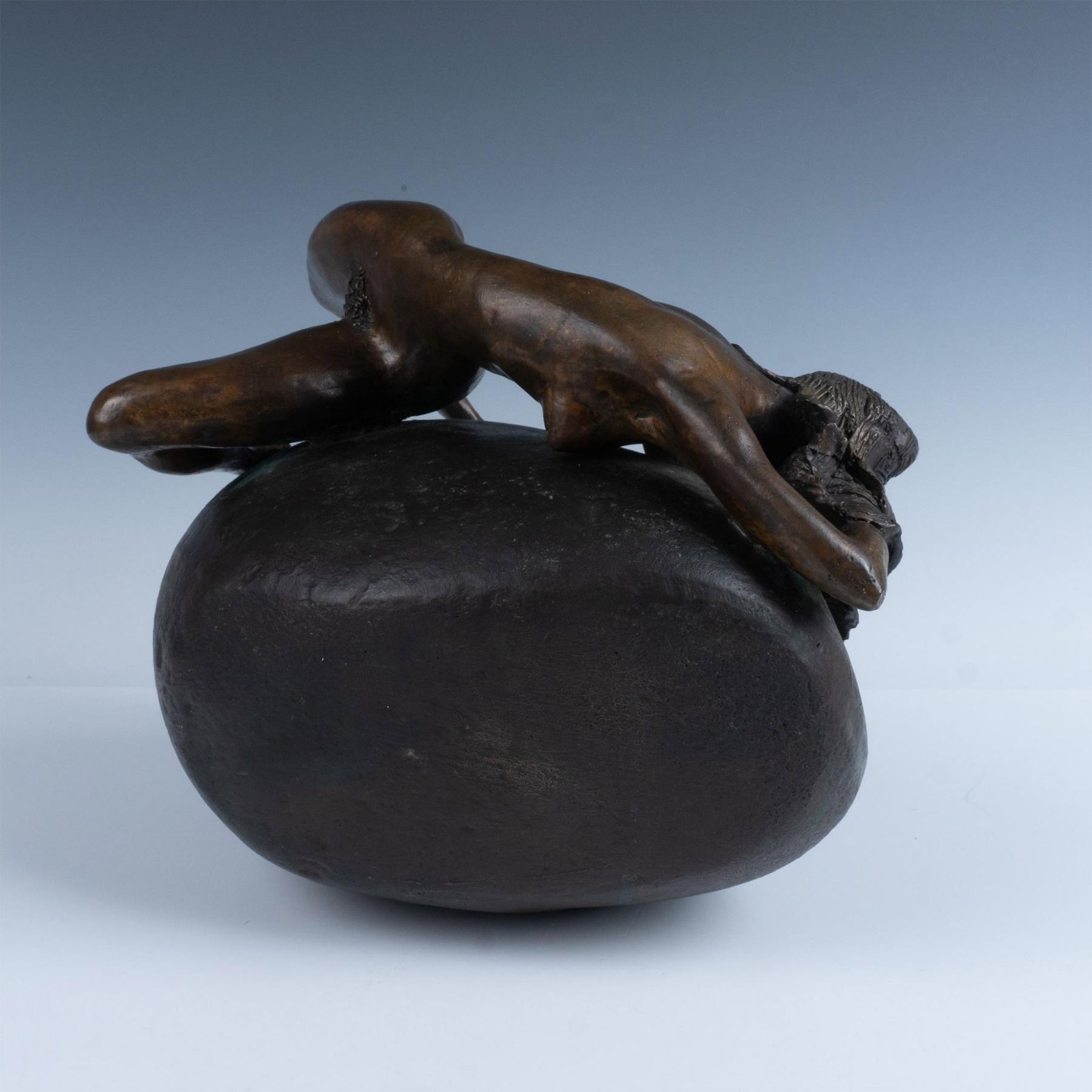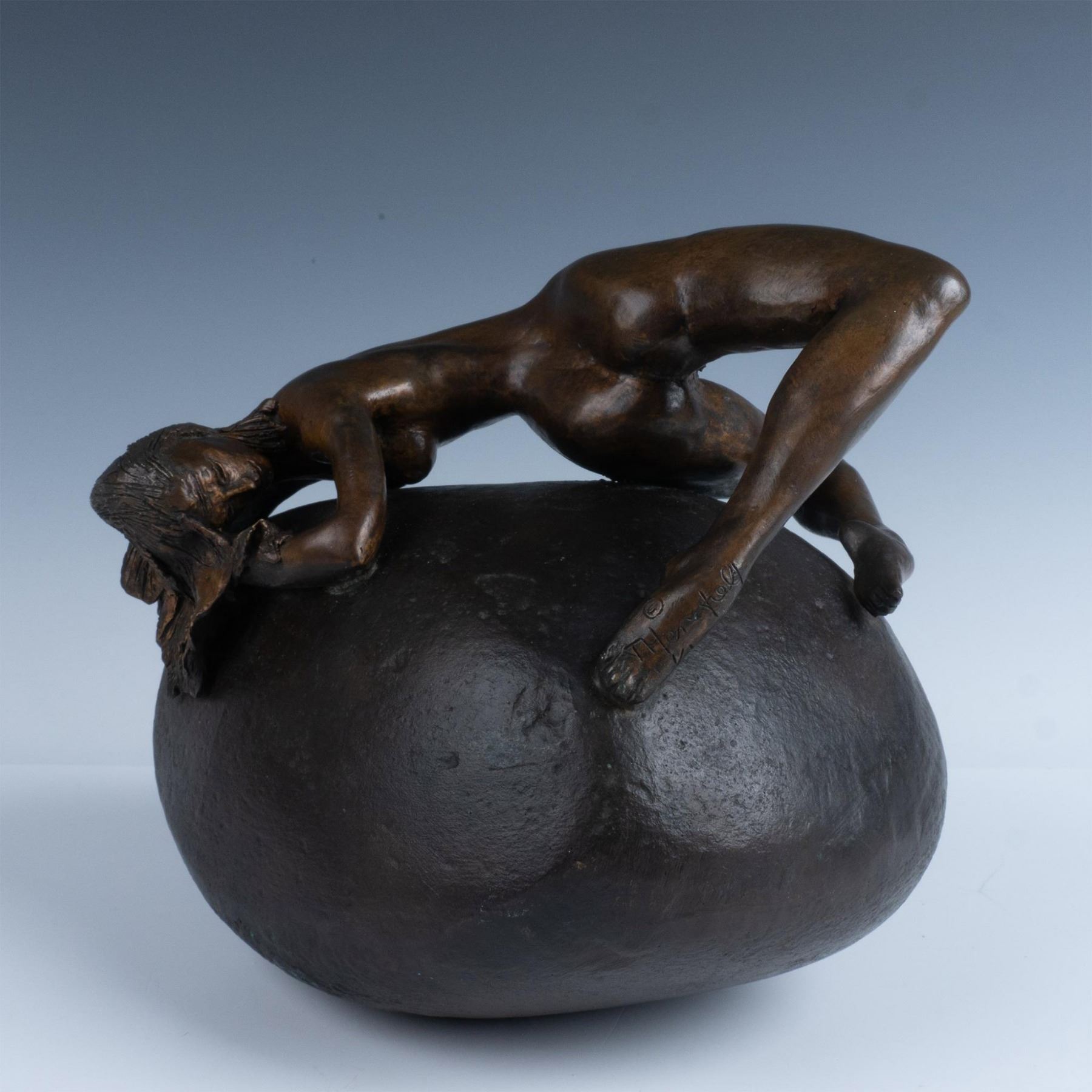 Gorgeous one-of-a-kind patinated bronze sculpture by figurative sculptor and draughtsman Australian-British sculptor Tom Merrifield. Part of his Rock Pieces series. Merrifield sculpts an erotic nude female lying upon a rock in a contorted, yet graceful pose. The rock base swivels allowing a multi-directional view of the model. Signature and edition number on base of foot: T. Merrifield 1/1. Sculpture dimensions: 11.50"L x 12"W x 9"H. Weight: 27.6 lbs.