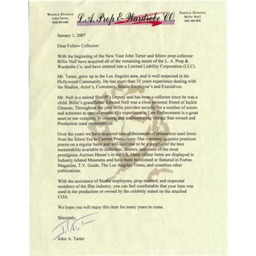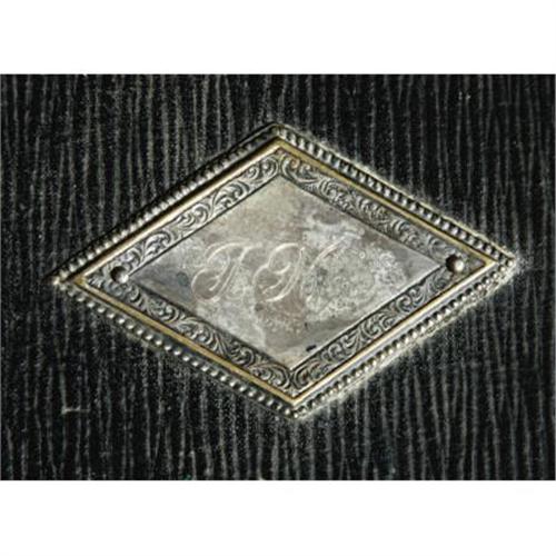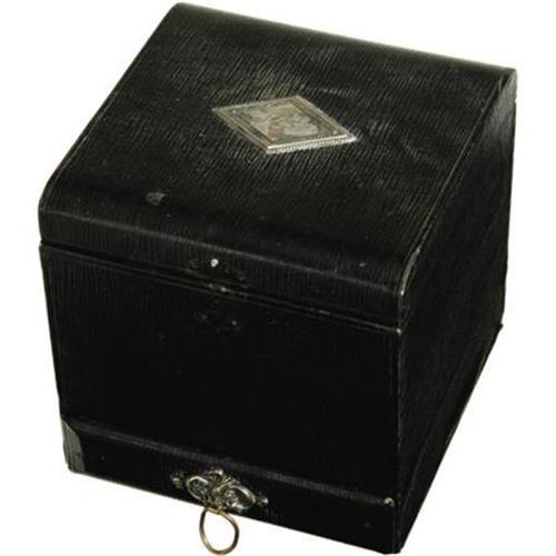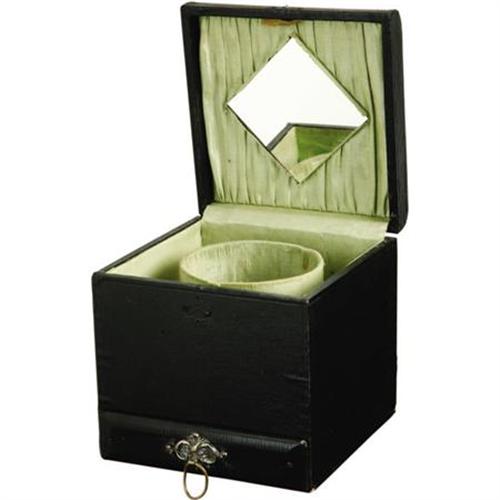 <B>Tom Mix Collar Storage Box.</B></I> This tasteful wooden box with black finish was used by silent-era Western star Tom Mix, and bears his initials engraved on a metal ornament on the lid, which opens to reveal a pale green silk-lined storage compartment for a starched collar with a small mirror. The small drawer on the bottom slides open to reveal a compartment for cuff links and other small sundries. The box measures 6" x 6" x 6" and is in Fine to Very Fine condition with some wear to the lining (especially inside the drawer), a missing latch for the main compartment, and mild overall wear and tarnishing. <I>Accompanied by an LOA from the L.A. Prop and Wardrobe Co.</B></I><BR><BR><b>Shipping:</b> Clothing, Costumes & Jerseys (<a target="_blank" href="http://www.heritageauctions.com/common/shipping.php">view shipping information</a>)