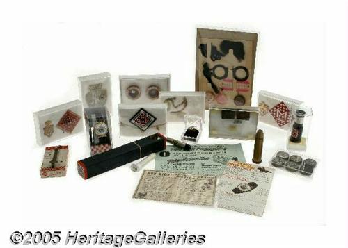 <B>Tom Mix Memorabilia Group (Various, 1930s-80s).</B></I> This impressive accumulation of Tom Mix memorabilia includes: signal arrowhead plastic whistle/siren/magnifier and directions (1949), signal flashlight (1939, lens missing), telegraph set with box mailer (1940), golden plastic bullet telescope and bird call (inside scope), Tom Mix's makeup kit with mailer (1940), bullet flashlight (1938), metal telescope (1938), cardboard periscope (1939, blue tube), Tom Mix Magic Light tiger eye ring with advertisement/order form (1950), revival wrist watch with original offer in original box (1982), two RCA Victor miniature TV film viewers with two film disks (1950), movie make-up kit (1937, five tins plus one duplicate), Ranch Boss brass rank badge with cloth checkered patch (1938), Straight Shooter "telephone" set (1938, lacks string), Wrangler brass badge with second version straight shooters fabric patch (1938), girl's brass dangle charm bracelet with about 4 charms and cloth patch (1936), and a Super Magnetic compass gun and whistle (1948). Grades vary widely, but most items are in generally very nice condition. Approximate value for group = $2,000.