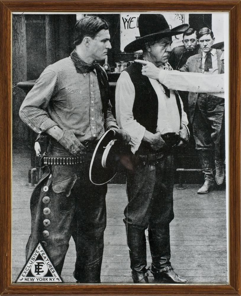 Pre-dating Mix’s promotional agreement with Stetson, this circa 1916 atypical black cowboy hat with white ribbon band, leather hat band and cream colored edge binding features a 4” brim, 7” crown. Includes material relating to movie use by Mix and numerous photos of him wearing same.PROVENANCE: Includes Letter of Authenticity from western expert and author, Boyd Magers.