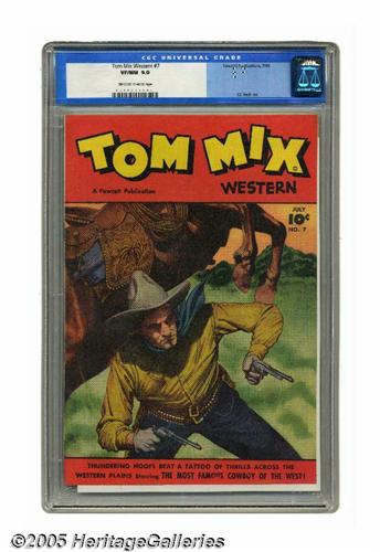 <B>Tom Mix Western #7 (Fawcett, 1948) CGC VF/NM 9.0 Off-white to white pages.</B></I> Includes a "Captain Tootsie" advertising page with art by C. C. Beck. Overstreet 2005 VF/NM 9.0 value = $245; NM- 9.2 value = $320. CGC census 3/05: 1 in 9.0, 7 higher.