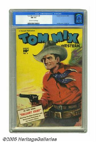 <B>Tom Mix Western #8 (Fawcett, 1948) CGC NM 9.4 Off-white to white pages.</B></I> Everett Raymond Kinstler went on to become a renowned portrait painter following his comic book career, and this cover gives you a look at his amazing talent. The issue has interior art by C. C. Beck. Overstreet 2005 NM- 9.2 value = $320. CGC census 3/05: 1 in 9.4, none higher.