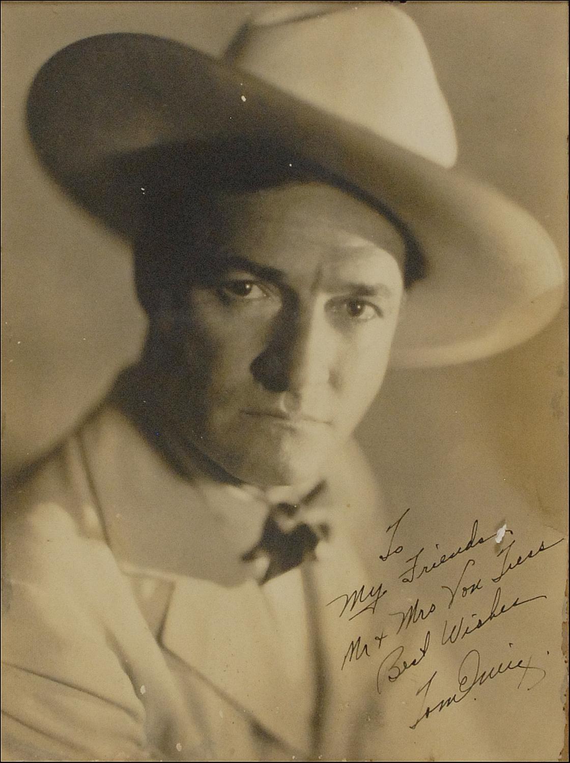 Vintage matte-finish 10 x 13.25 photo of Mix in cowboy attire, signed and inscribed in fountain pen “To My Friends Mr. & Mrs. Von Tress, Best Wishes, Tom Mix.” Affixed to same-sized piece of cardboard and framed to an overall size of 14.25 x 17.25. In very good condition, with strips of staining along the left side and lower left corner, a semi-circular stain to the right side touching his hat, edge chipping and chipping to the emulsion, and some areas of silvering to the darker areas.