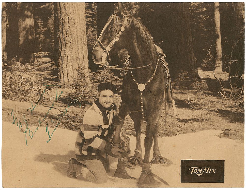 Vintage matte-finish 13 x 10 photo of Mix crouched down beside a horse, signed and inscribed in fountain pen, “To W. J. Harwood, Best wishes, Tom Mix.” In very good condition, with a diagonal crease to the right side and the box to the lower right colored in with black ink. An outstanding, western-themed photo of the early film star.