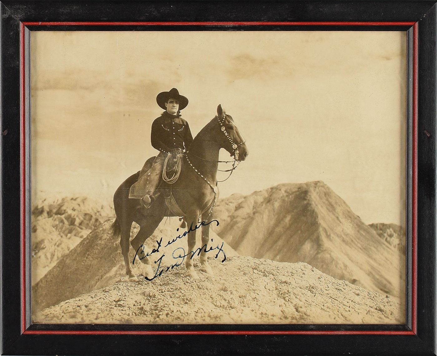 Vintage matte-finish 9 x 7 photo of Mix on horseback, signed in fountain pen, "Best wishes, Tom Mix." Framed and in fine condition.
