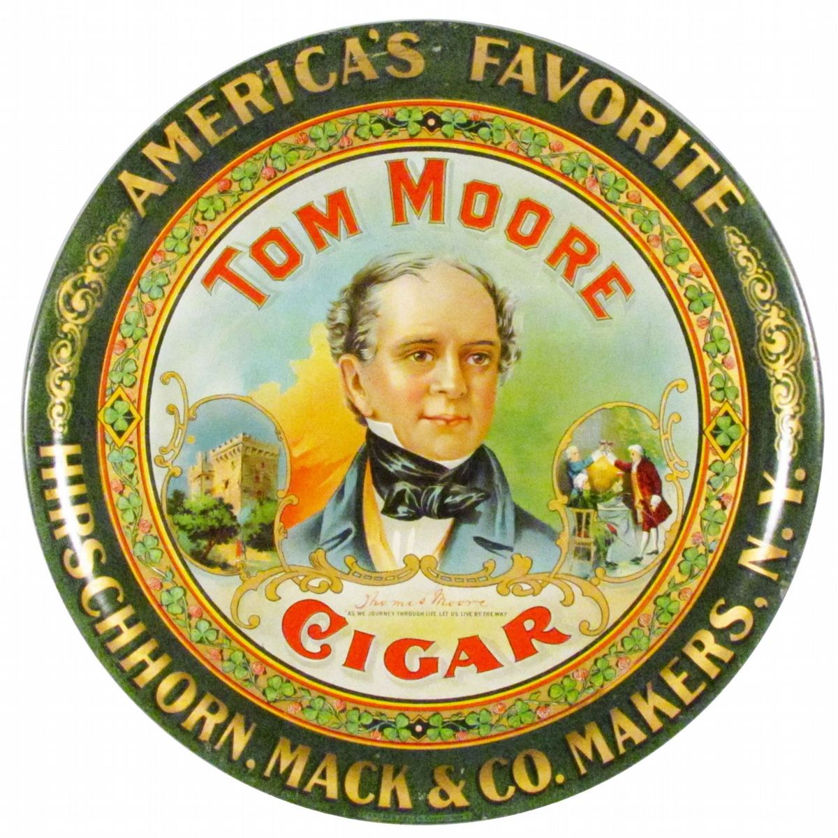 Tom Moore Cigars Tin Serving Tray. Standard Adv. Co. Coshocton, O. Undoubtably one of the most colorful trays ever made. Some minor edge ware otherwise very good condition. 13 inch diameter.