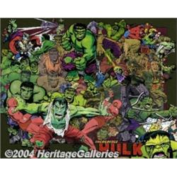 Tom Morehouse - Original Collage of The Silver Age Incredible Hulk (1994-2003). Originally designed as a presentation piece, this collage was part of a Jack Kirby tribute at the San Diego Comicon in 1994, the year Jack Kirby passed away. A favorite of the artist, Tom Morehouse, whose work can be seen on the endpapers of Marvel: Five Fabulous Decades Of The World's Greatest Comics, this collage's design was recently revised. An homage to one of Stan Lee and Jack Kirby's greatest creations, this large, 16" x 20", mixed-media collage incorporates seventy different printed images, all from panels drawn by Jack Kirby, and inked by almost everyone in the Marvel bullpen, highlighting the ever-changing look of the Hulk, as well as some of his most memorable battles. This is a one-of-a-kind work of art. Important notice: Heritage usually auctions material at the rate of 200-250 lots per hour. On some occasions eBay Live bid software or the Internet may not be able to keep up with the pace of the auction. We recommend placing a realistic absentee bid now as insurance to avoid disappointment. Occasionally the auctioneer may eliminate or reject an eBay Live bid, and the auctioneer may also reopen a lot after the close of the eBay live bidding (usually because we missed an audience bid), and may reject your bid even if it shows you as the winning bidder. By bidding via eBay Live, you agree that Heritage may award the lot to another bidder at its sole discretion under the circumstances described above or any other reasonable circumstances. Since eBay bids are not shown to us until we open the lot on the floor, we treat those bids just like floor bids. In most cases the floor responds before the eBay bid is presented to us, due to Internet lag time, so for consistency we have made it a policy that floor bids are always considered first over tie eBay live bids. Also please note that all Heritage lots purchased through eBay Live carry a 20% Buyer's Premium. Please make sure you read the Terms and Conditions before you bid.
