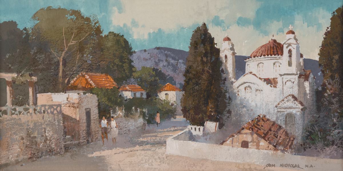 Tom Nicholas (1934 - ). Morning Light, Rhodes, Greece. 4 ¾" x 9" gouache. Signed lower right.
