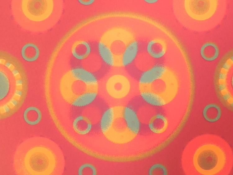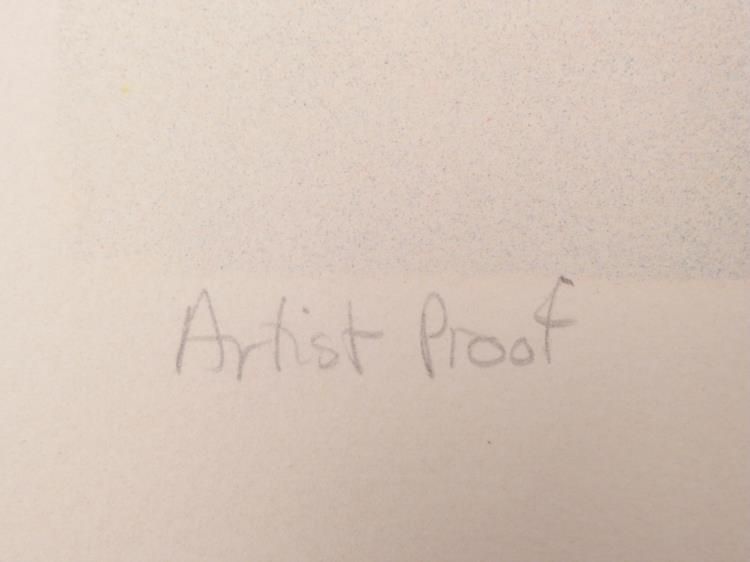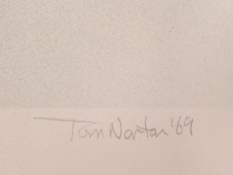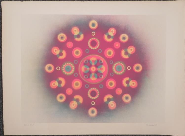 This circular pattern of geometric circles has layers of colors, and an almost 3-D effect if you stare at the center. Artist: Tom Norton Signature: "Tom Norton" in pencil, lower right Medium: Lithograph on rag paper with deckled top edge Year: 1969 Edition: Unnumbered artist proof, marked in pencil lower left "Artist Proof" Sheet size: 22 x 30 inches Condition: Excellent Biography:Tom Norton is an Artist, Musician, Composer and Performer based in Washington state. We are pleased to present from an estate a group of dedicated artist proofs.