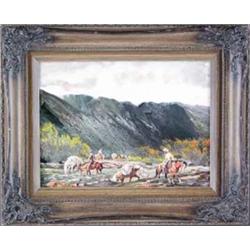Tom Olenchak. Oil on Board. Cowboy Scene. 9" x 12". signed lower left. Estimate $200 - $300.