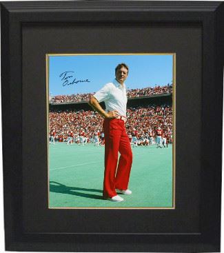 Tom Osborne is currently the athletic director at the University of Nebraska and coached college football there for 25 years. He also served 6 years in the U.S. House of Representatives for Nebraska. Osborne was a model of consistency. His teams never won fewer than nine games in a season, finished in the top 15 of the final AP poll 24 years out of 25 (having finished 24th in 1990), and were ranked in every single weekly AP poll barring one week in 1977 and two in 1981. Osborne's teams won outright national championships in 1994 and 1995, and a share of another in 1997. Osborne's Huskers also won or shared 12 Big Eight Conference titles and one Big 12 Conference title. Osborne was inducted into the College Football Hall of Fame in 1999. Tom Osborne has hand signed this 16x20 Photo. Schwartz Sports Hologram Certificate of Authenticity from Athlon Sports. Custom Black Mat and Premium Black Color Framed as shown.